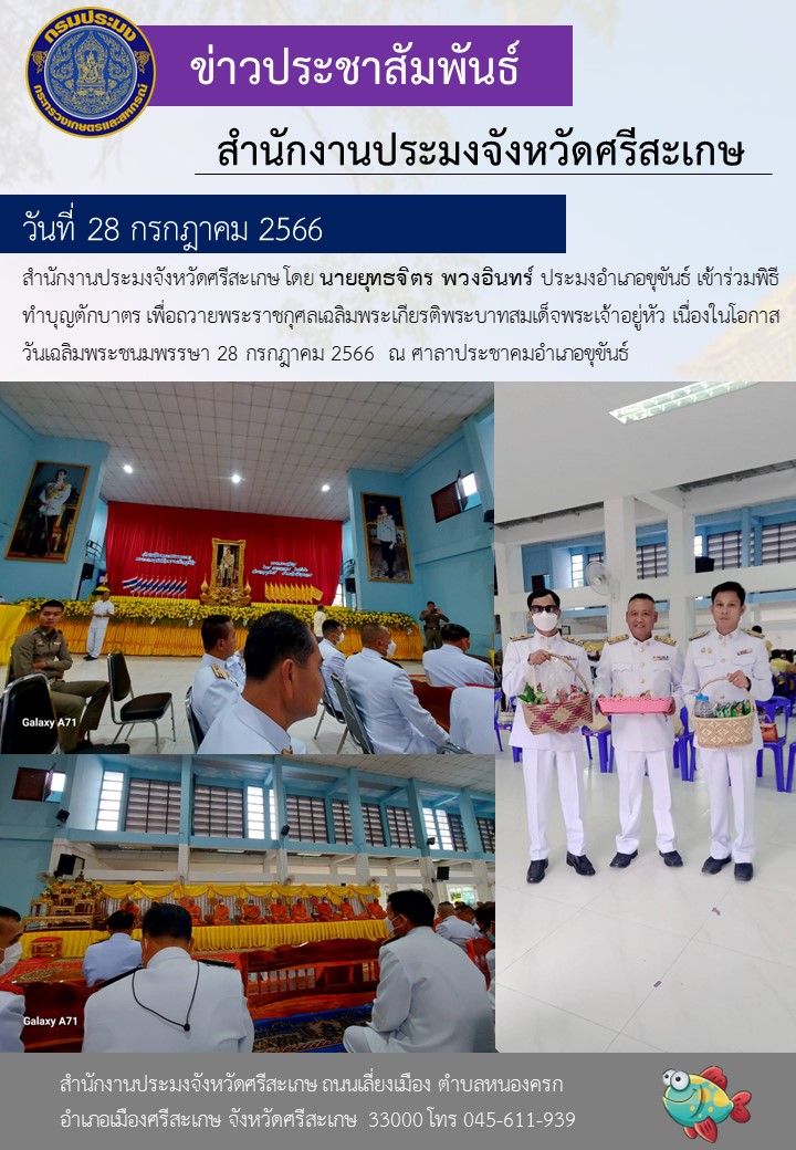 สำนักงานประมงจังหวัดศรีสะเกษ โดย นายยุทธจิตร พวงอินทร์ ประมงอำเภอขุขันธ์ เข้าร่วมพิธีทำบุญตักบาตร เพื่อถวายพระราชกุศลเฉลิมพระเกียรติพระบาทสมเด็จพระเจ้าอยู่หัว เนื่องในโอกาสวันเฉลิมพระชนมพรรษา 28 กรกฎาคม 2566 ณ ศาลาประชาคมอำเภอขุขันธ์