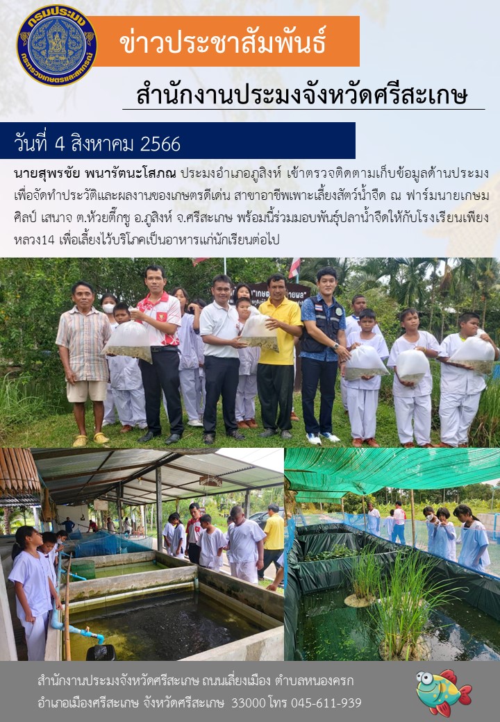 นายสุพรชัย พนารัตนะโสภณ ประมงอำเภอภูสิงห์ เข้าตรวจติดตามเก็บข้อมูลด้านประมง เพื่อจัดทำประวัติและผลงานของเกษตรดีเด่น สาขาอาชีพเพาะเลี้ยงสัตว์น้ำจืด ณ ฟาร์มนายเกษมศิลป์ เสนาจ ต.ห้วยตึ๊กชู อ.ภูสิงห์ จ.ศรีสะเกษ พร้อมนี้ร่วมมอบพันธุ์ปลาน้ำจืดให้กับโรงเรียนเพียงหลวง14 เพื่อเลี้ยงไว้บริโภคเป็นอาหารแก่นักเรียนต่อไป