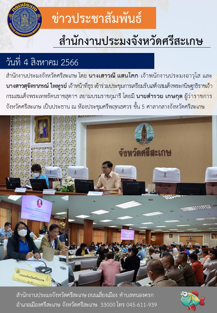 สำนักงานประมงจังหวัดศรีสะเกษ โดย นางเสาวณี แสนโคก เจ้าพนักงานประมงอาวุโส และนางสาวสุจิตราภรณ์ ไพทูรย์ เจ้าหน้าที่ธุรการ เข้าร่วมประชุมการเตรียมรับเสด็จสมเด็จพระกนิษฐาธิราชเจ้า กรมสมเด็จพระเทพรัตนราชสุดาฯ สยามบรมราชกุมารี โดยมี นายสำรวย เกษกุล ผู้ว่าราชการจังหวัดศรีสะเกษ เป็นประธาน ณ ห้องประชุมศรีพฤทเธศวร ชั้น 5 ศาลากลางจังหวัดศรีสะเกษ