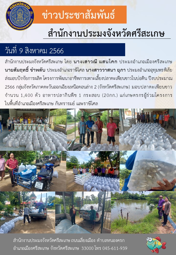 สำนักงานประมงจังหวัดศรีสะเกษ โดย นางเสาวณี แสนโคก ประมงอำเภอเมืองศรีสะเกษ นายสัมฤทธิ์ ขำพลับ ประมงอำเภอราษีไศล นางสาววาสนา ยุภา ประมงอำเภออุทุมพรพิสัย ส่งมอบปัจจัยการผลิต โครงการพัฒนาอาชีพการเพาะเลี้ยงปลาตะเพียนขาวในบ่อดิน ปีงบประมาณ 2566 กลุ่มจังหวัดภาคตะวันออกเฉียงเหนือตอนล่าง 2 (จังหวัดศรีสะเกษ) มอบปลาตะเพียนขาว จำนวน 1,400 ตัว อาหารปลากินพืช 1 กระสอบ (20กก.) แก่เกษตรกรผู้ร่วมโครงการ ในพื้นที่อำเภอเมืองศรีสะเกษ กันทรารมย์ และราษีไศล
