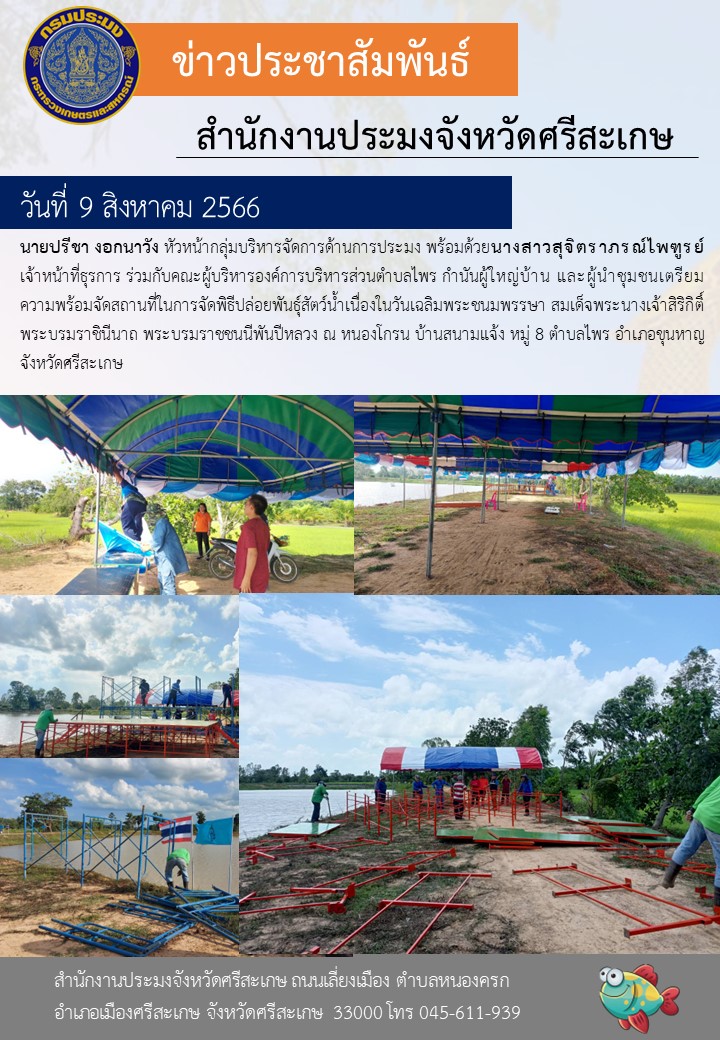 นายปรีชา งอกนาวัง หัวหน้ากลุ่มบริหารจัดการด้านการประมง พร้อมด้วยนางสาวสุจิตราภรณ์ไพฑูรย์ เจ้าหน้าที่ธุรการ ร่วมกับคณะผู้บริหารองค์การบริหารส่วนตำบลไพร กำนันผู้ใหญ่บ้าน และผู้นำชุมชนเตรียมความพร้อมจัดสถานที่ในการจัดพิธีปล่อยพันธุ์สัตว์น้ำเนื่องในวันเฉลิมพระชนมพรรษา สมเด็จพระนางเจ้าสิริกิติ์ พระบรมราชินีนาถ พระบรมราชชนนีพันปีหลวง ณ หนองโกรน บ้านสนามแจ้ง หมู่ 8 ตำบลไพร อำเภอขุนหาญ จังหวัดศรีสะเกษ