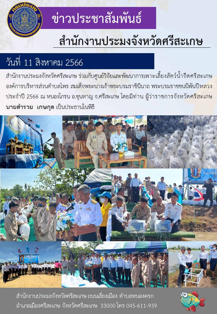 สำนักงานประมงจังหวัดศรีสะเกษ ร่วมกับศูนย์วิจัยและพัฒนาการเพาะเลี้ยงสัตว์น้ำจืด ศรีสะเกษ องค์การบริหารส่วนตำบลไพร จัดพี่ธีปล่อยพันธุ์สัตว์น้ำเฉลิมพระชนมพรรษาสมเด็จพระนางเจ้าพระบรมราชินีนาถ พระบรมราชชนนีพันปีหลวง ประจำปี 2566 ณ หนองโกรน อ.ขุนหาญ จ.ศรีสะเกษ โดยมีท่าน ผู้ว่าราชการจังหวัดศรีสะเกษ นายสำรวย เกษกุล เป็นประธานในพิธี