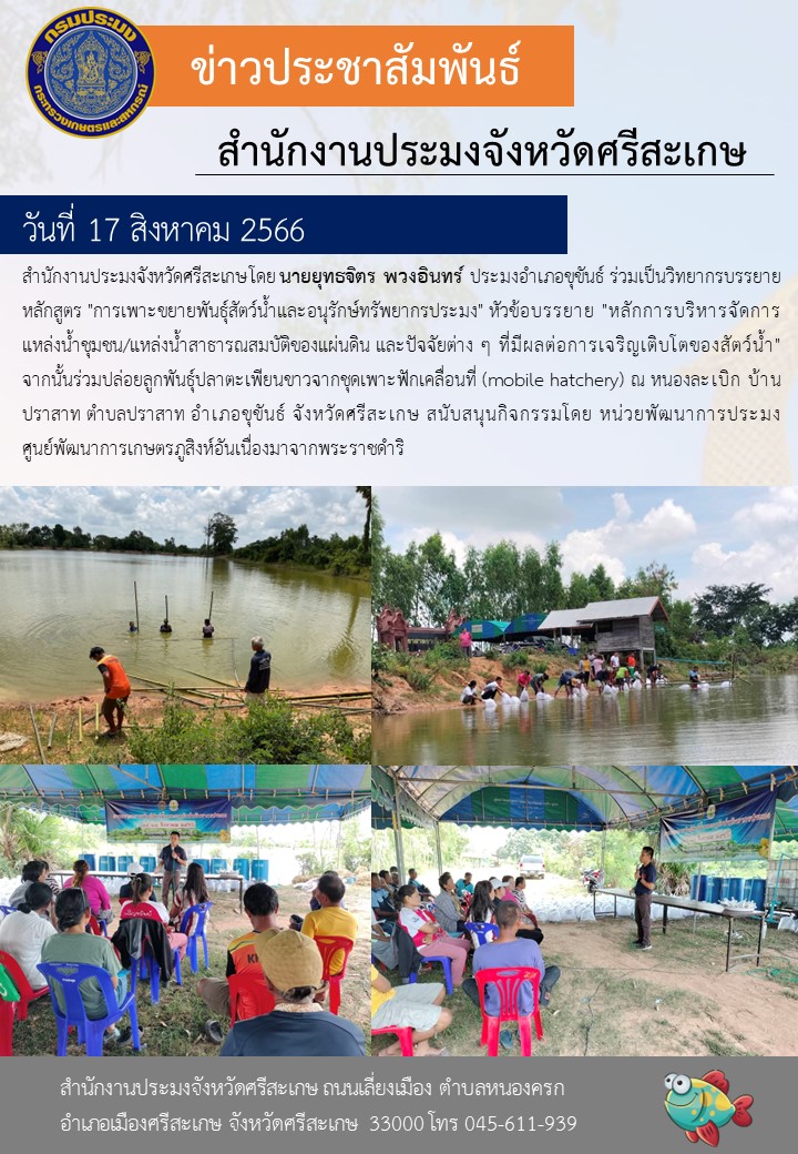 นายยุทธจิตร พวงอินทร์ ประมงอำเภอขุขันธ์ ร่วมเป็นวิทยากรบรรยายหลักสูตร "การเพาะขยายพันธุ์สัตว์น้ำและอนุรักษ์ทรัพยากรประมง" หัวข้อบรรยาย "หลักการบริหารจัดการแหล่งน้ำชุมชน/แหล่งน้ำสาธารณสมบัติของแผ่นดิน และปัจจัยต่าง ๆ ที่มีผลต่อการเจริญเติบโตของสัตว์น้ำ" จากนั้นร่วมปล่อยลูกพันธุ์ปลาตะเพียนขาวจากชุดเพาะฟักเคลื่อนที่ (mobile hatchery) ณ หนองละเบิก บ้านปราสาท ตำบลปราสาท อำเภอขุขันธ์ จังหวัดศรีสะเกษ สนับสนุนกิจกรรมโดย หน่วยพัฒนาการประมง ศูนย์พัฒนาการเกษตรภูสิงห์อันเนื่องมาจากพระราชดำริ