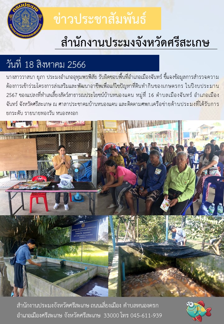 นางสาววาสนา ยุภา ประมงอำเภออุทุมพรพิสัย รับผิดชอบพื้นที่อำเภอเมืองจันทร์ ชี้แจงข้อมูลการสำรวจความต้องการเข้าร่วมโครงการส่งเสริมและพัฒนาอาชีพเพื่อแก้ไขปัญหาที่ดินทำกินของเกษตรกร ในปีงบประมาน2567 ของแปลงที่ทำเลเลี้ยงสัตว์สาธารณประโยชน์บ้านหนองแคน หมู่ที่ 16 ตำบลเมืองจันทร์ อำเภอเมืองจันทร์ จังหวัดศรีสะเกษ ณ ศาลาประชาคมบ้านหนองแคน และติดตามศพก.เครือข่ายด้านประมงที่ได้รับการยกระดับ รายนายทองวัน หนองหงอก