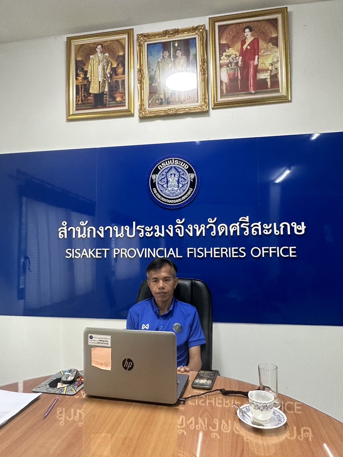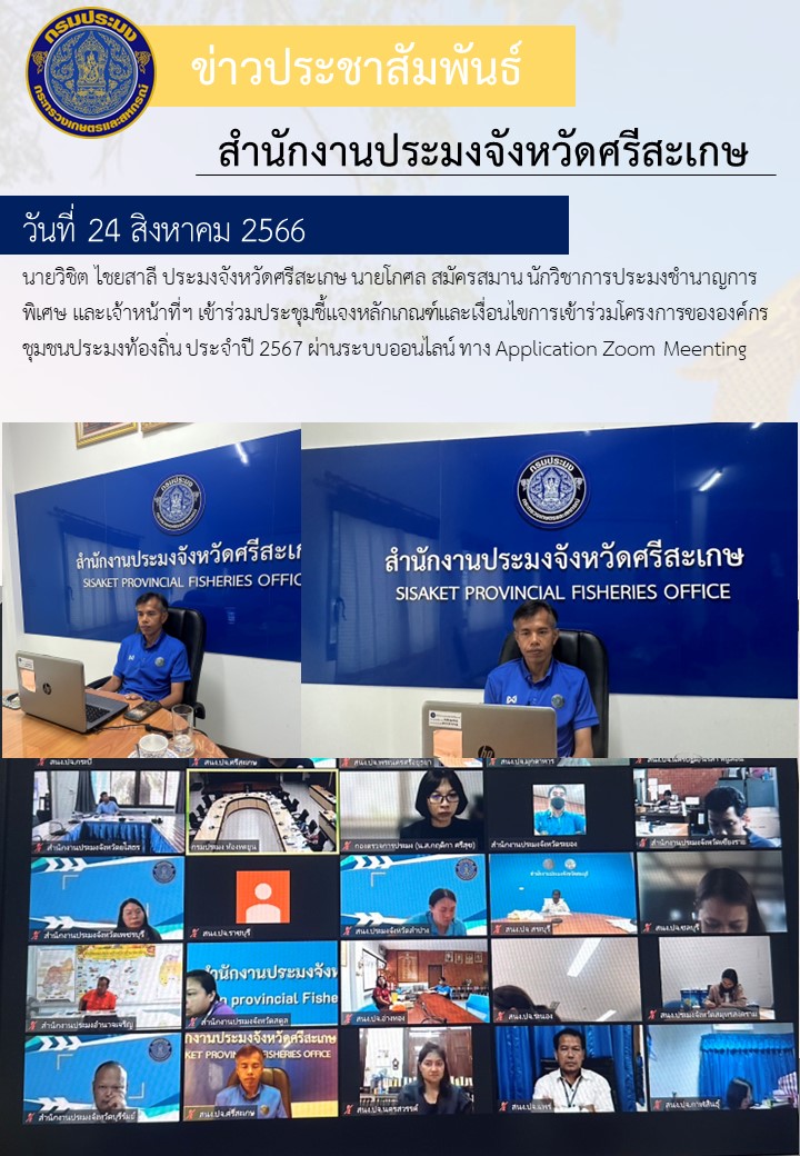 นายวิชิต ไชยสาลี ประมงจังหวัดศรีสะเกษ นายโกศล สมัครสมาน นักวิชาการประมงชำนาญการพิเศษ และเจ้าหน้าที่ฯ เข้าร่วมประชุมชี้แจงหลักเกณฑ์และเงื่อนไขการเข้าร่วมโครงการขององค์กรชุมชนประมงท้องถิ่น ประจำปี 2567 ผ่านระบบออนไลน์ ทาง Application Zoom Meenting