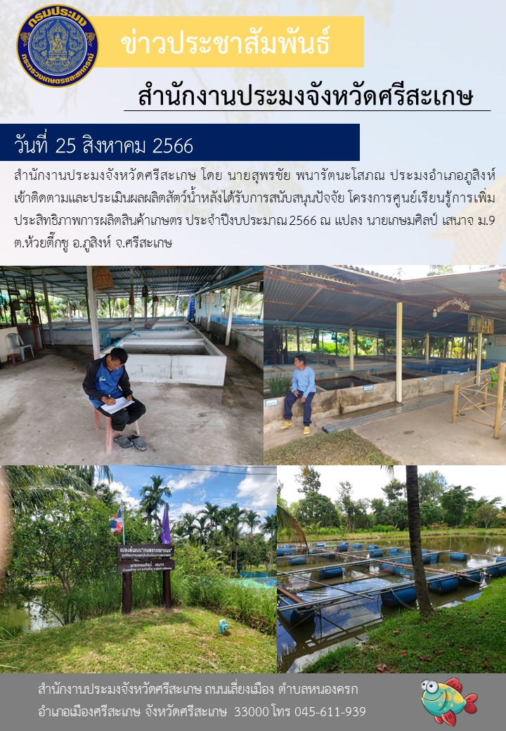 สำนักงานประมงจังหวัดศรีสะเกษ โดย นายสุพรชัย พนารัตนะโสภณ ประมงอำเภอภูสิงห์ เข้าติดตามและประเมินผลผลิตสัตว์น้ำหลังได้รับการสนับสนุนปัจจัย โครงการศูนย์เรียนรู้การเพิ่มประสิทธิภาพการผลิตสินค้าเกษตร ประจำปีงบประมาณ 2566 ณ แปลง นายเกษมศิลป์ เสนาจ ม.9 ต.ห้วยตึ๊กชู อ.ภูสิงห์ จ.ศรีสะเกษ