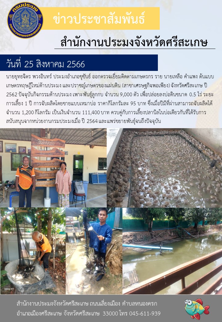 นายยุทธจิตร พวงอินทร์ ประมงอำเภอขุขันธ์ ออกตรวจเยี่ยมติดตามเกษตรกร ราย นายเหลือ คำแพง ต้นแบบเกษตรทฤษฎีใหม่ด้านประมง และปราชญ์เกษตรของแผ่นดิน (สาขาเศรษฐกิจพอเพียง) จังหวัดศรีสะเกษ ปี 2562 ปัจจุบันกิจกรรมด้านประมง เพาะพันธุ์ลูกกบ จำนวน 9,000 ตัว เพื่อปล่อยลงบ่อดินขนาด 0.5 ไร่ ระยะการเลี้ยง 1 ปี การจับผลิตโดยขายแบบเหมาบ่อ ราคากิโลกรัมละ 95 บาท ซึ่งเมื่อปีมีที่ผ่านสามารถจับผลิตได้ จำนวน 1,200 กิโลกรัม เป็นเงินจำนวน 111,400 บาท ควบคู่กับการเลี้ยงปลานิลในบ่อเดียวกันที่ได้รับการสนับสนุนจากหน่วยงานกรมประมงเมื่อ ปี 2564 และแพร่ขยายพันธุ์จนถึงปัจจุบัน