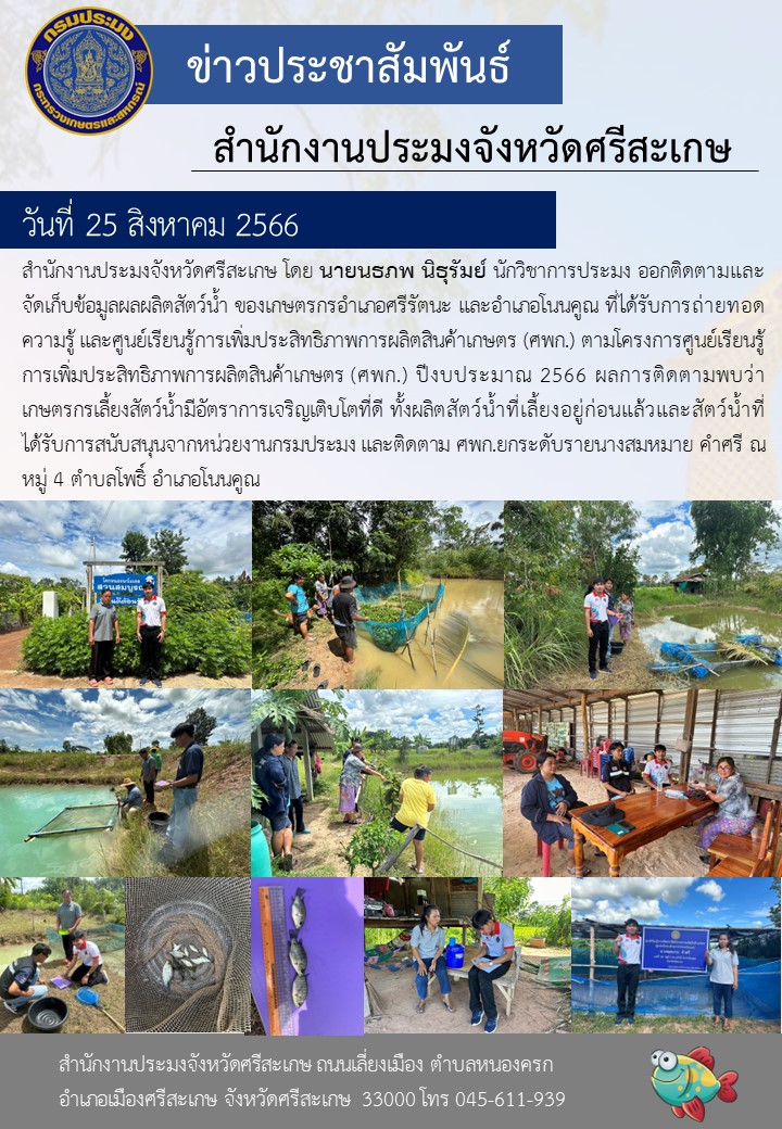 สำนักงานประมงจังหวัดศรีสะเกษ โดย นายนธภพ นิธุรัมย์ นักวิชาการประมง ออกติดตามและจัดเก็บข้อมูลผลผลิตสัตว์น้ำ ของเกษตรกรอำเภอศรีรัตนะ และอำเภอโนนคูณ ที่ได้รับการถ่ายทอดความรู้ และศูนย์เรียนรู้การเพิ่มประสิทธิภาพการผลิตสินค้าเกษตร (ศพก.) ตามโครงการศูนย์เรียนรู้การเพิ่มประสิทธิภาพการผลิตสินค้าเกษตร (ศพก.) ปีงบประมาณ 2566 ผลการติดตามพบว่าเกษตรกรเลี้ยงสัตว์น้ำมีอัตราการเจริญเติบโตที่ดี ทั้งผลิตสัตว์น้ำที่เลี้ยงอยู่ก่อนแล้วและสัตว์น้ำที่ได้รับการสนับสนุนจากหน่วยงานกรมประมง และติดตาม ศพก.ยกระดับรายนางสมหมาย คำศรี ณ หมู่ 4 ตำบลโพธิ์ อำเภอโนนคูณ