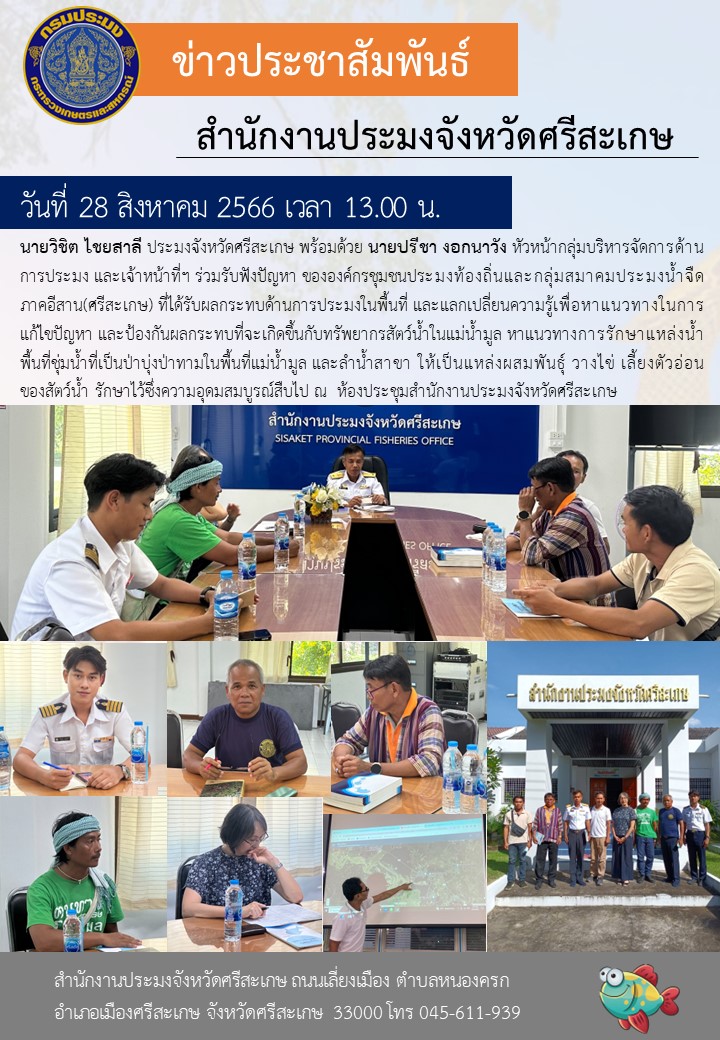 นายวิชิต ไชยสาลี ประมงจังหวัดศรีสะเกษ พร้อมด้วย นายปรีชา งอกนาวัง หัวหน้ากลุ่มบริหารจัดการด้านการประมง และเจ้าหน้าที่ฯ ร่วมรับฟังปัญหา ขององค์กรชุมชนประมงท้องถิ่นและกลุ่มสมาคมประมงน้ำจืด ภาคอีสาน(ศรีสะเกษ) ที่ได้รับผลกระทบด้านการประมงในพื้นที่ และแลกเปลี่ยนความรู้เพื่อหาแนวทางในการแก้ไขปัญหา และป้องกันผลกระทบที่จะเกิดขึ้นกับทรัพยากรสัตว์น้ำในแม่น้ำมูล หาแนวทางการรักษาแหล่งน้ำพื้นที่ชุ่มน้ำที่เป็นป่าบุ่งป่าทามในพื้นที่แม่น้ำมูล และลำน้ำสาขา ให้เป็นแหล่งผสมพันธุ์ วางไข่ เลี้ยงตัวอ่อน ของสัตว์น้ำ รักษาไว้ซึ่งความอุดมสมบูรณ์สืบไป ณ ห้องประชุมสำนักงานประมงจังหวัดศรีสะเกษ