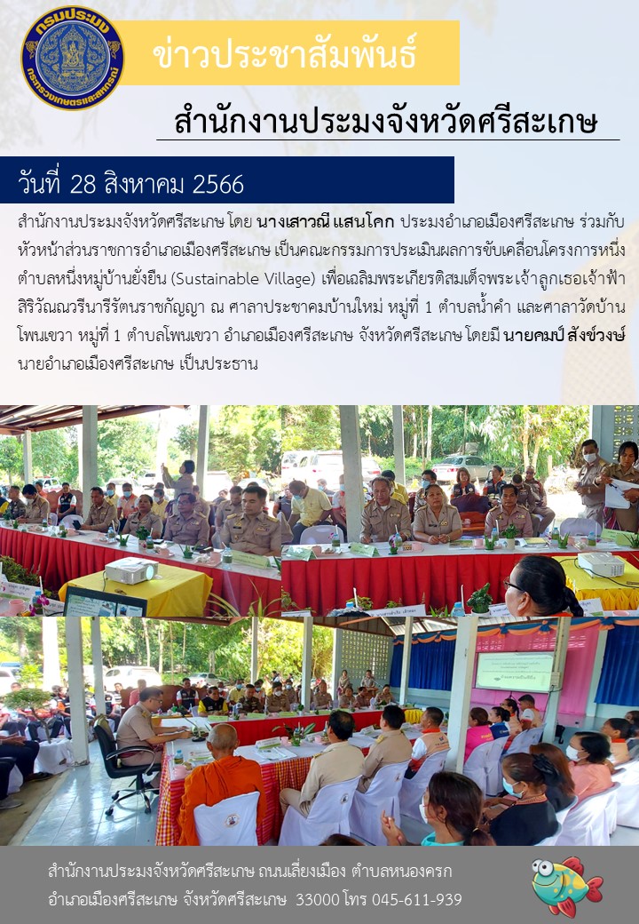 สำนักงานประมงจังหวัดศรีสะเกษ โดย นางเสาวณี แสนโคก ประมงอำเภอเมืองศรีสะเกษ ร่วมกับหัวหน้าส่วนราชการอำเภอเมืองศรีสะเกษ เป็นคณะกรรมการประเมินผลการขับเคลื่อนโครงการหนึ่งตำบลหนึ่งหมู่บ้านยั่งยืน (Sustainable Village) เพื่อเฉลิมพระเกียรติสมเด็จพระเจ้าลูกเธอเจ้าฟ้า สิริวัณณวรีนารีรัตนราชกัญญา ณ ศาลาประชาคมบ้านใหม่ หมู่ที่ 1 ตำบลน้ำคำ และศาลาวัดบ้านโพนเขวา หมู่ที่ 1 ตำบลโพนเขวา อำเภอเมืองศรีสะเกษ จังหวัดศรีสะเกษ โดยมี นายคมป์ สังข์วงษ์ นายอำเภอเมืองศรีสะเกษ เป็นประธาน