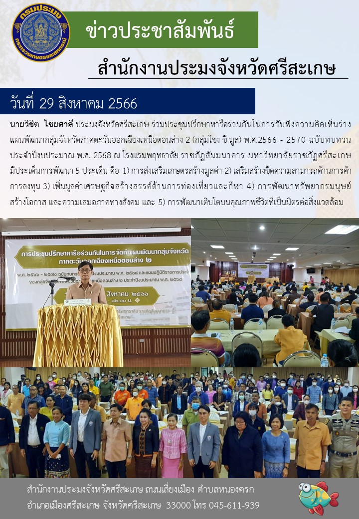 นายวิชิต ไชยสาลี ประมงจังหวัดศรีสะเกษ ร่วมประชุมปรึกษาหารือร่วมกันในการรับฟังความคิดเห็นร่างแผนพัฒนากลุ่มจังหวัดภาคตะวันออกเฉียงเหนือตอนล่าง 2 (กลุ่มโขง ชี มูล) พ.ศ.2566 - 2570 ฉบับทบทวน ประจำปีงบประมาณ พ.ศ. 2568 ณ โรงแรมพฤทธาลัย ราชภัฏสัมมนาคาร มหาวิทยาลัยราชภัฏศรีสะเกษ มีประเด็นการพัฒนา 5 ประเด็น คือ 1) การส่งเสริมเกษตรสร้างมูลค่า 2) เสริมสร้างขีดความสามารถด้านการค้าการลงทุน 3) เพิ่มมูลค่าเศรษฐกิจสร้างสรรค์ด้านการท่องเที่ยวและกีฬา 4) การพัฒนาทรัพยากรมนุษย์ สร้างโอกาส และความเสมอภาคทางสังคม และ 5) การพัฒนาเติบโตบนคุณภาพชีวิตที่เป็นมิตรต่อสิ่งแวดล้อม