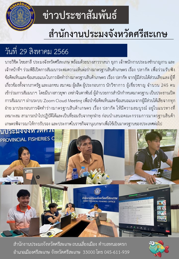 นายวิชิต ไชยสาลี ประมงจังหวัดศรีสะเกษ พร้อมด้วยนางสาววาสนา ยุภา เจ้าพนักงานประมงชำนาญงาน และเจ้าหน้าที่ฯ ร่วมพิธีเปิดการสัมมนาระดมความเห็นต่อร่างมาตรฐานสินค้าเกษตร เรื่อง ปลากัด เพื่อร่วมรับฟังข้อคิดเห็นและข้อเสนอแนะในการจัดทำร่างมาตรฐานสินค้าเกษตร เรื่อง ปลากัด จากผู้มีส่วนได้ส่วนเสียและผู้ที่เกี่ยวข้องทั้งจากภาครัฐ และเอกชน สมาคม ผู้ผลิต ผู้ประกอบการ นักวิชาการ ผู้เชี่ยวชาญ จำนวน 245 คน เข้าร่วมการสัมมนาฯ โดยมีนางสาวยุพา เหล่าจินดาพันธ์ ผู้อำนวยการสำนักกำหนดมาตรฐาน เป็นประธานเปิดการสัมมนาฯ ผ่านระบบ Zoom Cloud Meeting