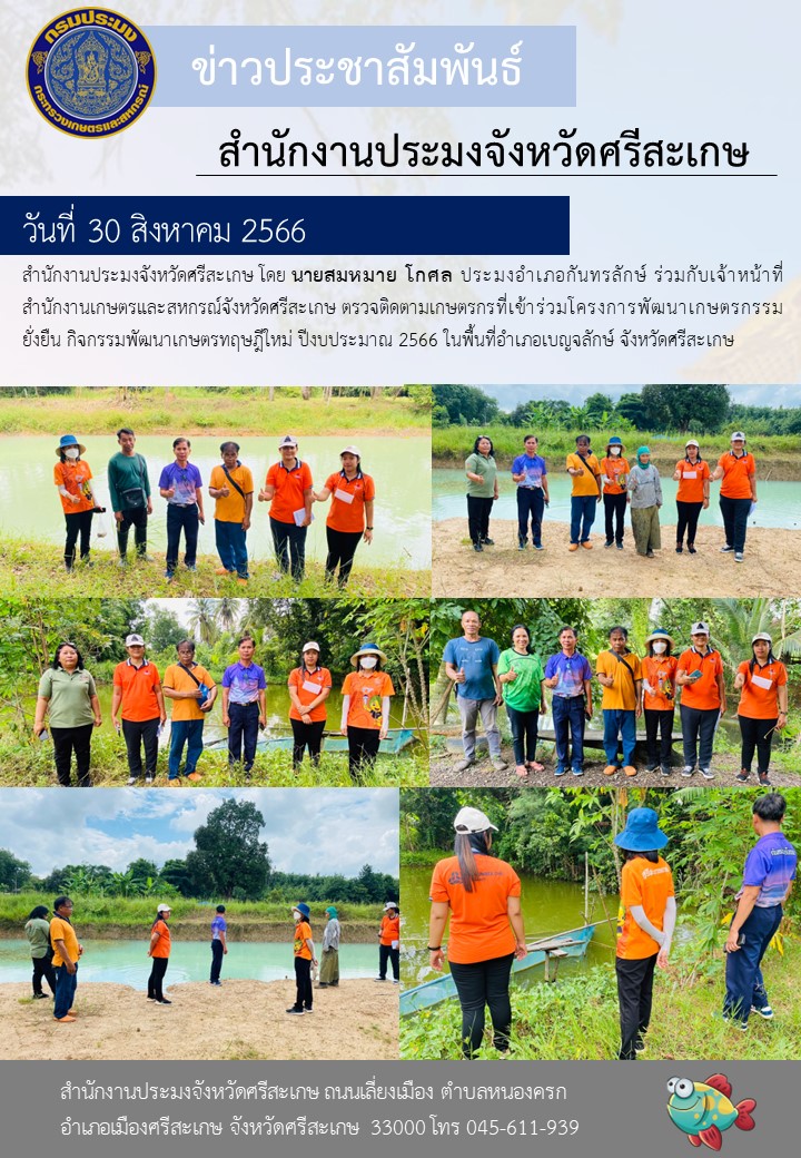 สำนักงานประมงจังหวัดศรีสะเกษ โดย นายสมหมาย โกศล ประมงอำเภอกันทรลักษ์ ร่วมกับเจ้าหน้าที่สำนักงานเกษตรและสหกรณ์จังหวัดศรีสะเกษ ตรวจติดตามเกษตรกรที่เข้าร่วมโครงการพัฒนาเกษตรกรรมยั่งยืน กิจกรรมพัฒนาเกษตรทฤษฎีใหม่ ปีงบประมาณ 2566 อำเภอเบญจลักษ์ จังหวัดศรีสะเกษ