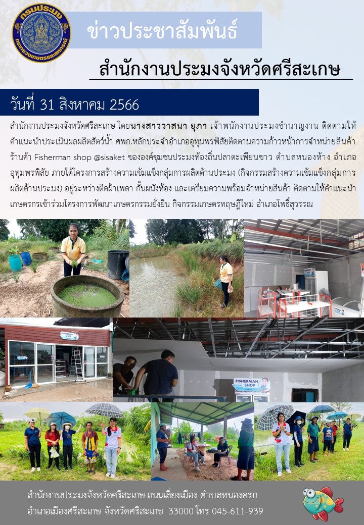 นางสาววาสนา ยุภา เจ้าพนักงานประมงชำนาญงาน ติดตามให้คำแนะนำประเมินผลผลิตสัตว์น้ำ ศพก.หลักประจำอำเภออุทุมพรพิสัยติดตามความก้าวหน้าการจำหน่ายสินค้า ร้านค้า Fisherman shop @sisaket ขององค์ชุมชนประมงท้องถิ่นปลาตะเพียนขาว ตำบลหนองห้าง อำเภออุทุมพรพิสัย ภายใต้โครงการสร้างความเข้มแข็งกลุ่มการผลิตด้านประมง (กิจกรรมสร้างความเข้มแข็งกลุ่มการผลิตด้านประมง) อยู่ระหว่างติดฝ้าเพดา กั้นผนังห้อง และเตรียมความพร้อมจำหน่ายสินค้า ติดตามให้คำแนะนำเกษตรกรเข้าร่วมโครงการพัฒนาเกษตรกรรมยั่งยืน กิจกรรมเกษตรทฤษฎีใหม่ อำเภอโพธิ์สุวรรณ