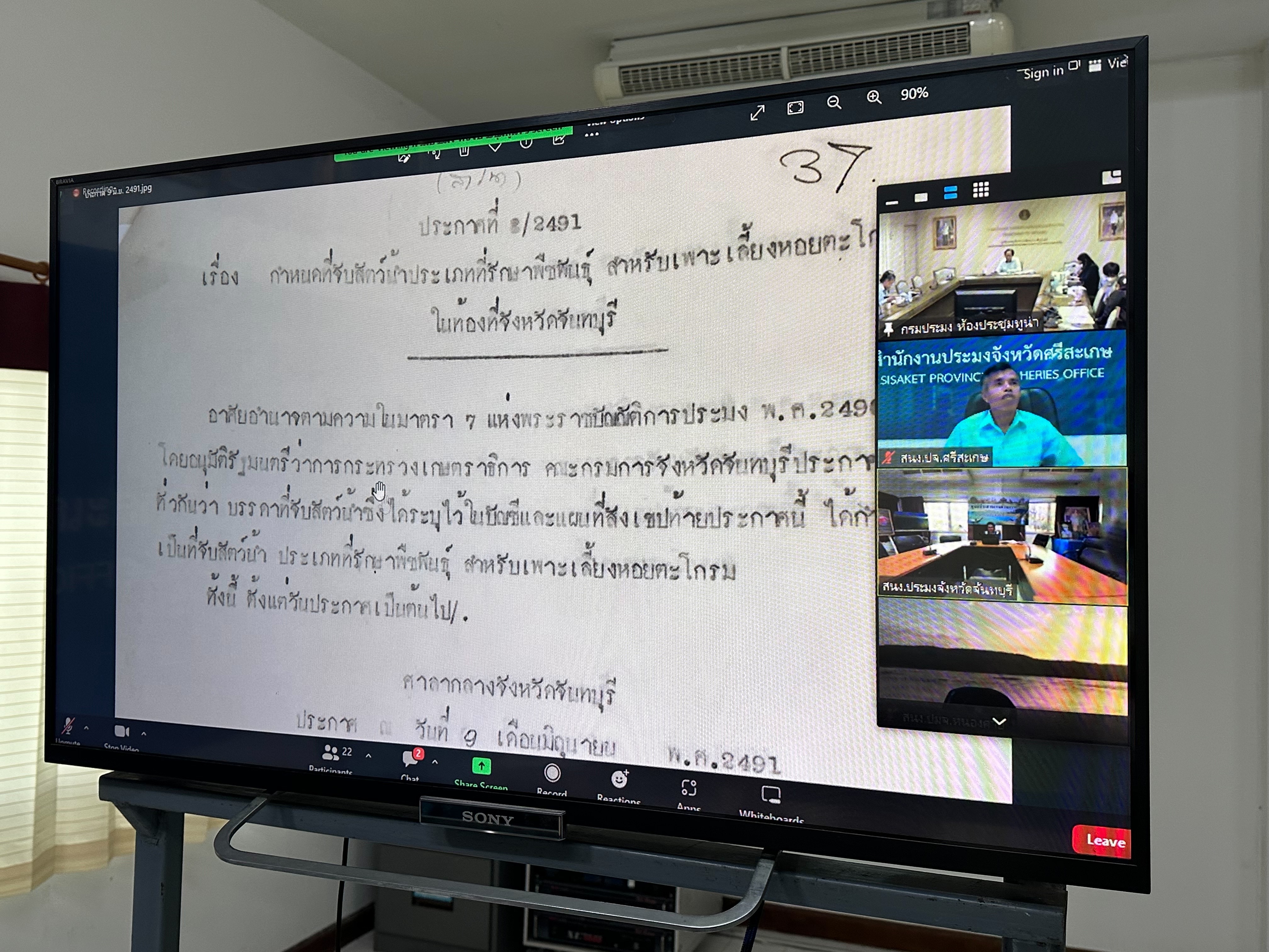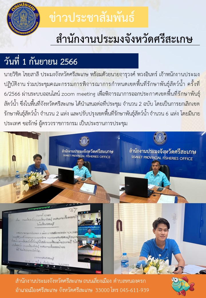 นายวิชิต ไชยสาลี ประมงจังหวัดศรีสะเกษ พร้อมด้วยนายจารุวงศ์ พวงอินทร์ เจ้าพนักงานประมงปฏิบัติงาน ร่วมประชุมคณะกรรมการพิจารณาการกำหนดเขตพื้นที่รักษาพันธุ์สัตว์น้ำ ครั้งที่ 6/2566 ผ่านระบบออนไลน์ zoom meeting เพื่อพิจารณาการออกประกาศเขตพื้นที่รักษาพันธุ์สัตว์น้ำ ซึ่งในพื้นที่จังหวัดศรีสะเกษ ได้นำเสนอต่อที่ประชุม จำนวน 2 ฉบับ โดยเป็นการยกเลิกเขตรักษาพันธุ์สัตว์น้ำ จำนวน 2 แห่ง และปรับปรุงเขตพื้นที่รักษาพันธุ์สัตว์น้ำ จำนวน 6 แห่ง โดยมีนายประเทศ ซอรักษ์ ผู้ตรวจราชการกรม เป็นประธานการประชุม