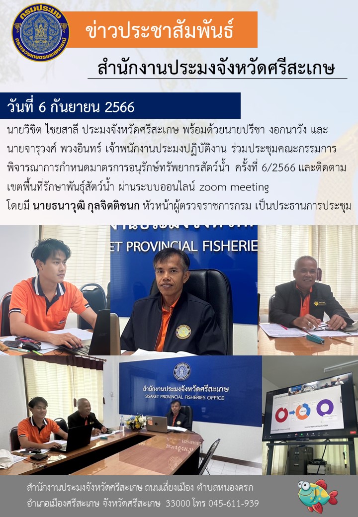 นายวิชิต ไชยสาลี ประมงจังหวัดศรีสะเกษ พร้อมด้วยนายปรีชา งอกนาวัง และนายจารุวงศ์ พวงอินทร์ เจ้าพนักงานประมงปฏิบัติงาน ร่วมประชุมคณะกรรมการพิจารณาการกำหนดมาตรการอนุรักษ์ทรัพยากรสัตว์น้ำ ครั้งที่ 6/2566 และติดตามเขตพื้นที่รักษาพันธุ์สัตว์น้ำ ผ่านระบบออนไลน์ zoom meetingโดยมีนายธนาวุฒิ กุลจิตติชนก หัวหน้าผู้ตรวจราชการกรม เป็นประธานการประชุม