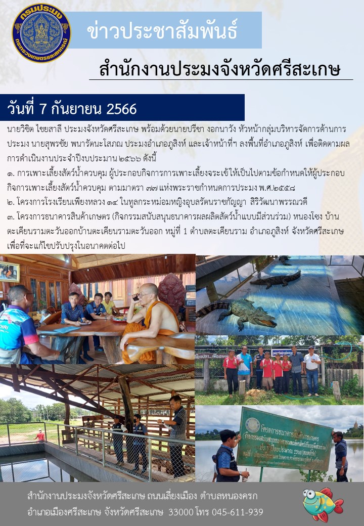 นายวิชิต ไชยสาลี ประมงจังหวัดศรีสะเกษ พร้อมด้วยนายปรีชา งอกนาวัง หัวหน้ากลุ่มบริหารจัดการด้านการประมง นายสุพรชัย พนารัตนะโสภณ ประมงอำเภอภูสิงห์ และเจ้าหน้าที่ฯ ลงพื้นที่อำเภอภูสิงห์ เพื่อติดตามผลการดำเนินงานประจำปีงบประมาน ๒๕๖๖ ดังนี้