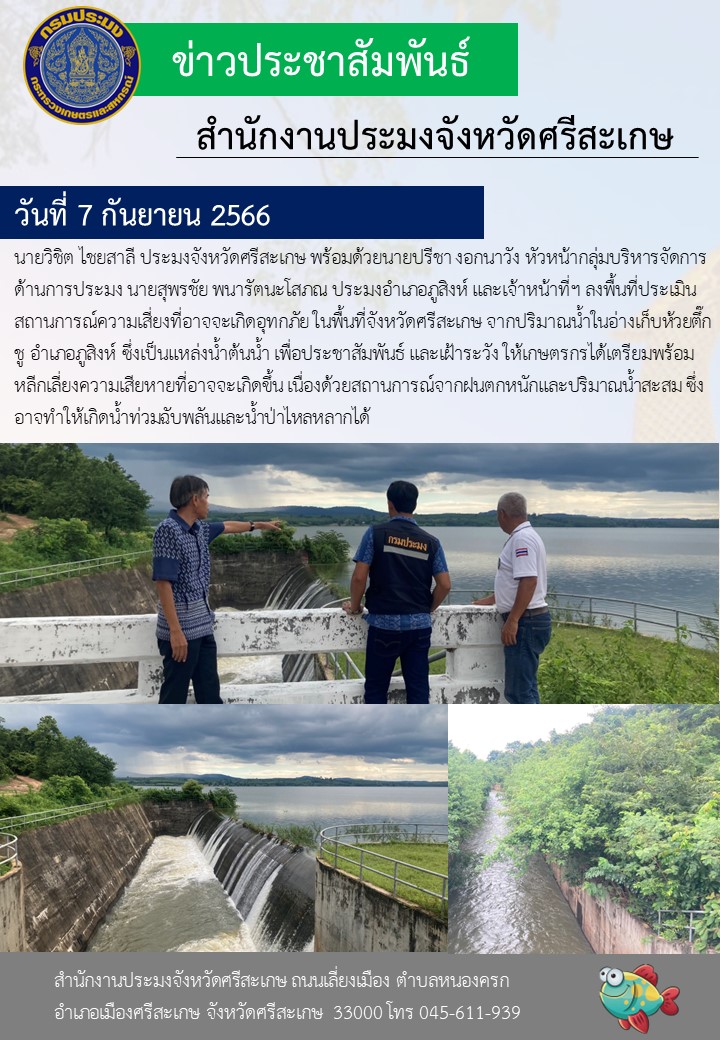 นายวิชิต ไชยสาลี ประมงจังหวัดศรีสะเกษ พร้อมด้วยนายปรีชา งอกนาวัง หัวหน้ากลุ่มบริหารจัดการด้านการประมง นายสุพรชัย พนารัตนะโสภณ ประมงอำเภอภูสิงห์ และเจ้าหน้าที่ฯ ลงพื้นที่ประเมินสถานการณ์ความเสี่ยงที่อาจจะเกิดอุทกภัย ในพื้นที่จังหวัดศรีสะเกษ จากปริมาณน้ำในอ่างเก็บห้วยตึ๊กชู อำเภอภูสิงห์ ซึ่งเป็นแหล่งน้ำต้นน้ำ เพื่อประชาสัมพันธ์ และเฝ้าระวัง ให้เกษตรกรได้เตรียมพร้อมหลีกเลี่ยงความเสียหายที่อาจจะเกิดขึ้น เนื่องด้วยสถานการณ์จากฝนตกหนักและปริมาณน้ำสะสม ซึ่งอาจทำให้เกิดน้ำท่วมฉับพลันและน้ำป่าไหลหลากได้