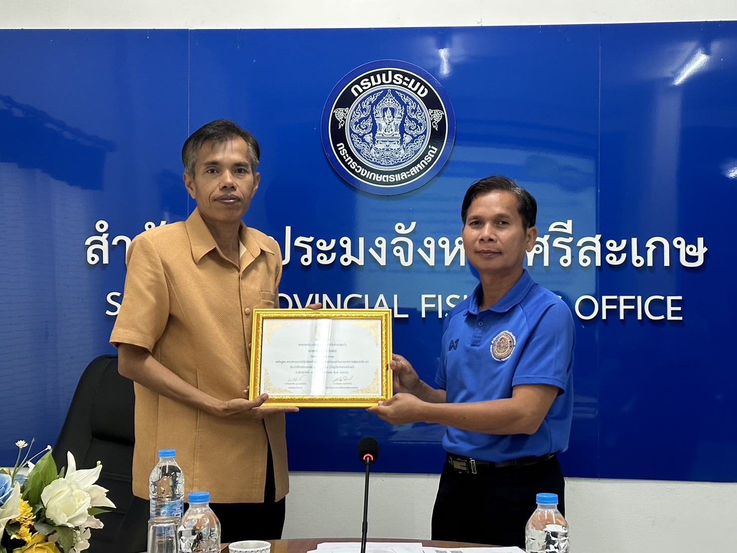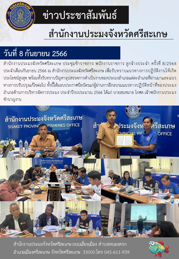 สำนักงานประมงจังหวัดศรีสะเกษ ประชุมข้าราชการ พนักงานราชการ ลูกจ้างประจำ ครั้งที่ 8/2566 ประจำเดือนกันยายน 2566 ณ สำนักงานประมงจังหวัดศรีสะเกษ เพื่อรับทราบแนวทางการปฏิบัติงานให้เกิดประโยชน์สูงสุด พร้อมทั้งรับทราบปัญหาอุปสรรคการดำเนินงานของประมงอำเภอแต่ละอำเภอที่ผ่านมาและแนวทางการปรับปรุงแก้ไขต่อไป ทั้งนี้ได้มอบประกาศนียบัตรแก่ผู้ผ่านการฝึกอบรมแนวทางปฏิบัติหน้าที่ของประมงอำเภอด้านการบริหารจัดการประมง ประจำปีงบประมาณ 2566 ได้แก่ นายสมหมาย โกศล เจ้าพนักงานประมงชำนาญงาน