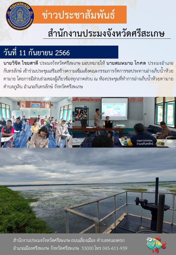 นายวิชิต ไชยสาลี ประมงจังหวัดศรีสะเกษ มอบหมายให้นายสมหมาย โกศล ประมงอำเภอกันทรลักษ์ เข้าร่วมประชุมเสริมสร้างความเข้มแข็งคณะกรรมการจัดการชลประทานอ่างเก็บน้ำห้วยตามาย โดยการมีส่วนร่วมของผู้เกี่ยวข้องทุกภาคส่วน ณ ห้องประชุมที่ทำการอ่างเก็บน้ำห้วยตามาย ตำบลภูเงิน อำเภอกันทรลักษ์ จังหวัดศรีสะเกษ