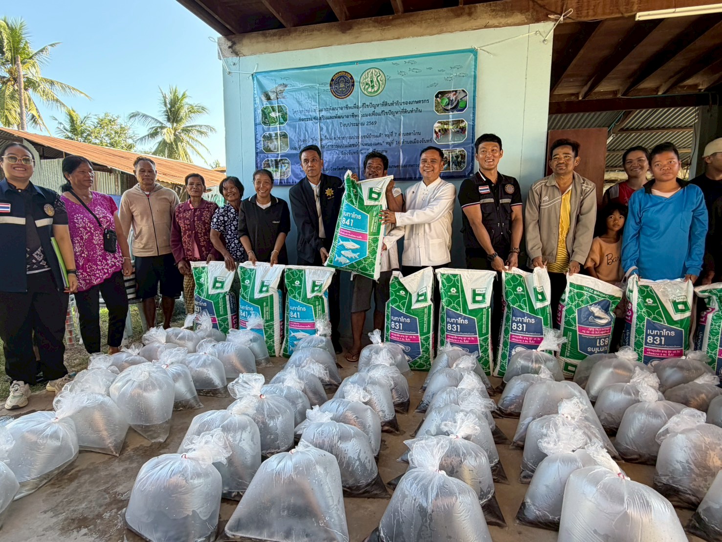 สำนักงานประมงจังหวัดศรีสะเกษ โดยนายอิสระ สุวิทยาภรณ์ ประมงจังหวัดศรีสะเกษ พร้อมด้วยนายประจักษ์ แสนภักดี หัวหน้ากลุ่มบริหารจัดการด้านการประมง นายสุพรชัย พนารัตนะโสภณ ประมงอำเภออุทุมพรพิสัย นางเสาวณี แสนโคก ประมงอำเภอเมืองศรีสะเกษ และเจ้าหน้าที่กลุ่มฯ  ลงพื้นที่มอบปัจจัยการผลิตในการส่งเสริมการเพาะเลี้ยงสัตว์น้ำ โครงการส่งเสริม และพัฒนาอาชีพเพื่อแก้ไขปัญหาที่ดินทำกินของเกษตรกร ประจำปีประมาณ พ.ศ. 2569 ให้กับเกษตรกรที่เข้าร่วมโครงการฯ จำนวน 16 ราย ประกอบไปด้วย พันธุ์ปลาดุกรัสเซีย จำนวน 5,800 ตัว พันธุ์ปลานิล จำนวน 3,450 ตัว พันธุ์ปลาตะเพียน จำนวน 3,450 ตัว  อาหารปลาดุกเล็ก จำนวน 10 กระสอบ และอาหารปลากินพืชเล็ก จำนวน 6 กระสอบ ณ ที่ทำการผู้ใหญ่บ้าน หมู่ที่ 7 ตำบลตาโกน อำเภอเมืองจันทร์ จังหวัดศรีสะเกษ