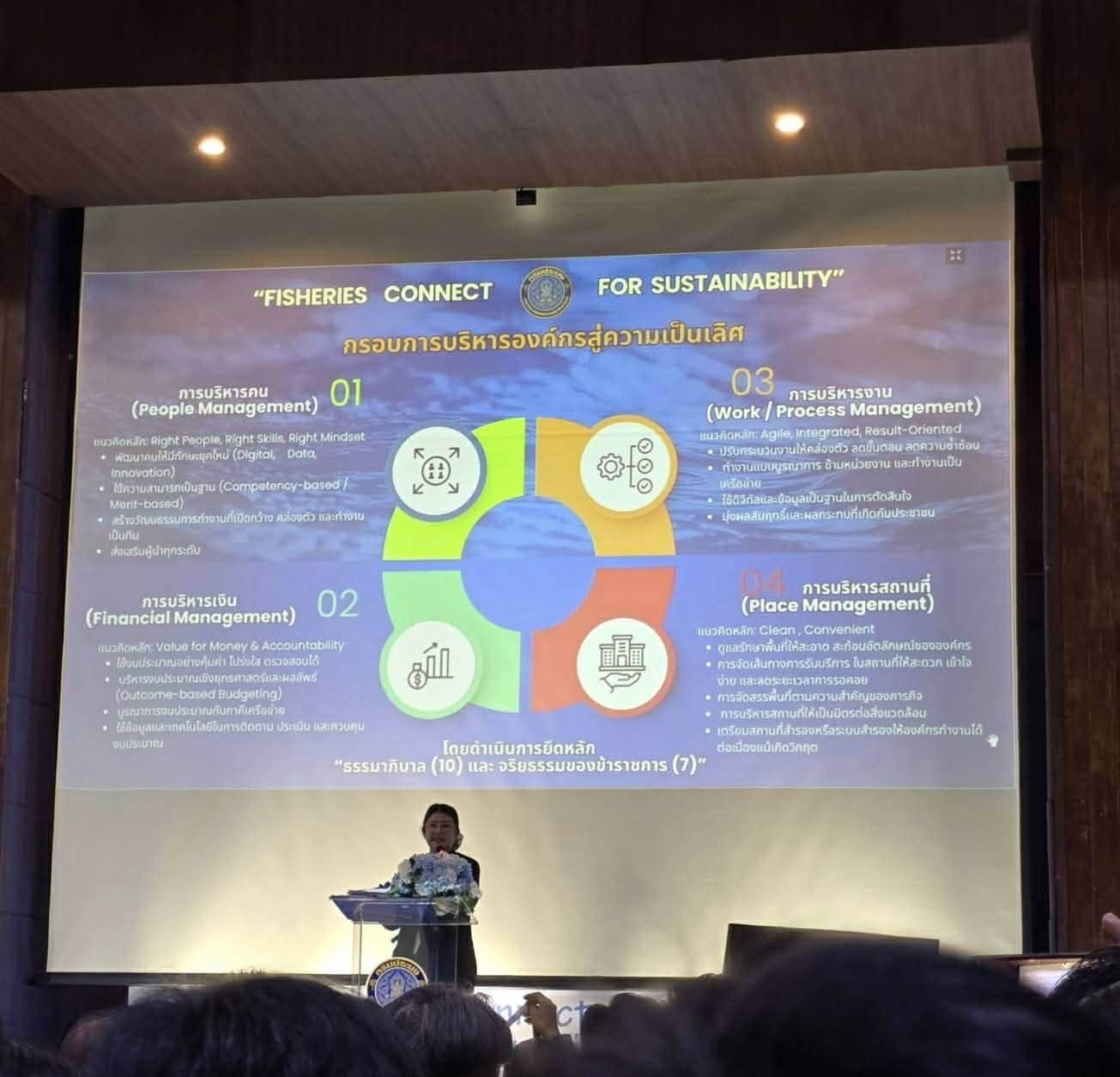 อธิบดีกรมประมง กล่าวทิ้งท้ายว่า นโยบายและทิศทางการดำเนินงานดังกล่าว มีเป้าหมายสำคัญไม่ใช่เพียงแค่ทำให้สำเร็จตามตัวชี้วัด แต่คือต้องการเห็นผลลัพธ์ที่เป็นรูปธรรมที่พร้อมเชื่อมโยงภาคประมงไทยสู่ความเป็นเลิศทุกมิติ ซึ่งสามารถนำพากรมประมงก้าวสู่การเป็นองค์กรภาครัฐยุคใหม่ที่ยกระดับภาคการประมงไทยให้เติบโตอย่างมั่นคงและยั่งยืนตามแนวคิด“FISHERIES CONNECT FOR SUSTAINABILITY” ที่สอดรับกับนโยบายของกระทรวงเกษตรและสหกรณ์ และยุทธศาสตร์ชาติต่อไป