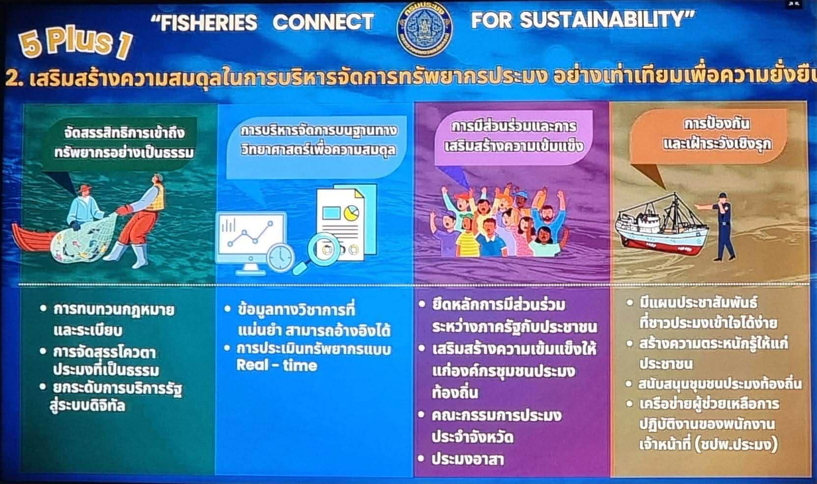 2. เสริมสร้างความสมดุลในการบริหารจัดการทรัพยากรประมง อย่างเท่าเทียม เพิ่มความยั่งยืน โดยจัดสรรสิทธิการเข้าถึงทรัพยากรประมงอย่างเป็นธรรม บนฐานข้อมูลทางวิชาการที่ถูกต้องและทันสมัย ส่งเสริมการมีส่วนร่วมของทุกภาคส่วน ทั้งชุมชน องค์กรปกครองส่วนท้องถิ่น พร้อมยกระดับการควบคุม ป้องกัน ปราบปราม และเฝ้าระวังการทำประมงผิดกฎหมาย เพื่อให้เกิดการใช้ประโยชน์จากทรัพยากรอย่างสมดุลและยั่งยืน