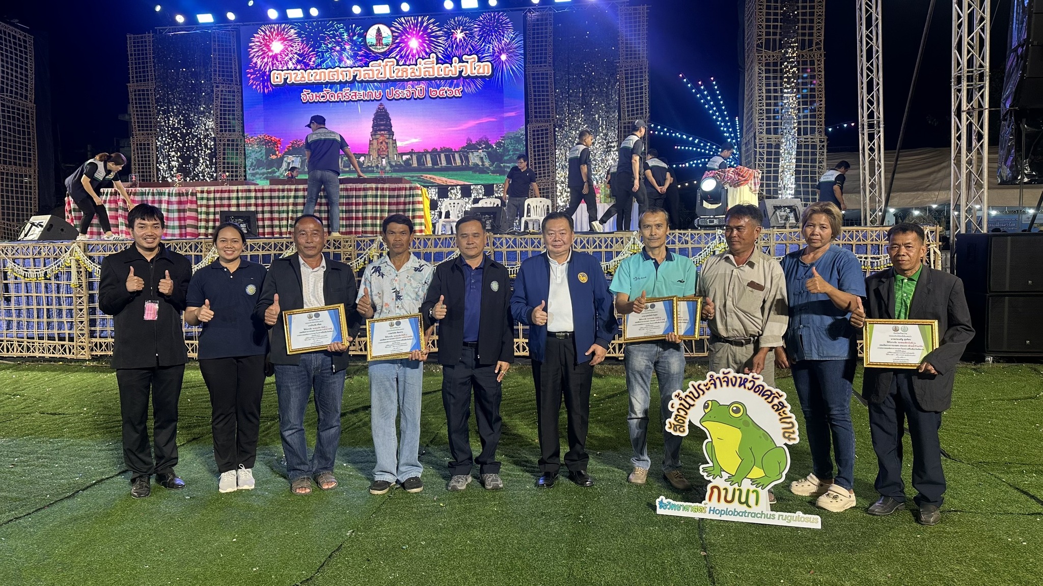 นายอิสระ สุวิทยาภรณ์ ประมงจังหวัดศรีสะเกษ พร้อมด้วยนายอาคม มุขมณีย์ ประมงอำเภอกันทรารมย์ และเจ้าหน้าที่สำนักงานฯ นำเกษตรกรเข้ารับเกียรติบัตรและเงินรางวัลการประกวดผลผลิตทางการเกษตร ในงานเทศกาลปีใหม่สี่เผ่าไทศรีสะเกษ ประจำปี 2569 จำนวน 2 รายการ ได้แก่ กบยักษ์เพศเมีย และกบยักษ์เพศผู้ โดยมีนายอนุรัตน์ ธรรมประจำจิต ผู้ว่าราชการจังหวัดศรีสะเกษ เป็นประธานในพิธีมอบรางวัล ณ เวทีกลางฯ สนามหน้าศาลากลางจังหวัดศรีสะเกษ