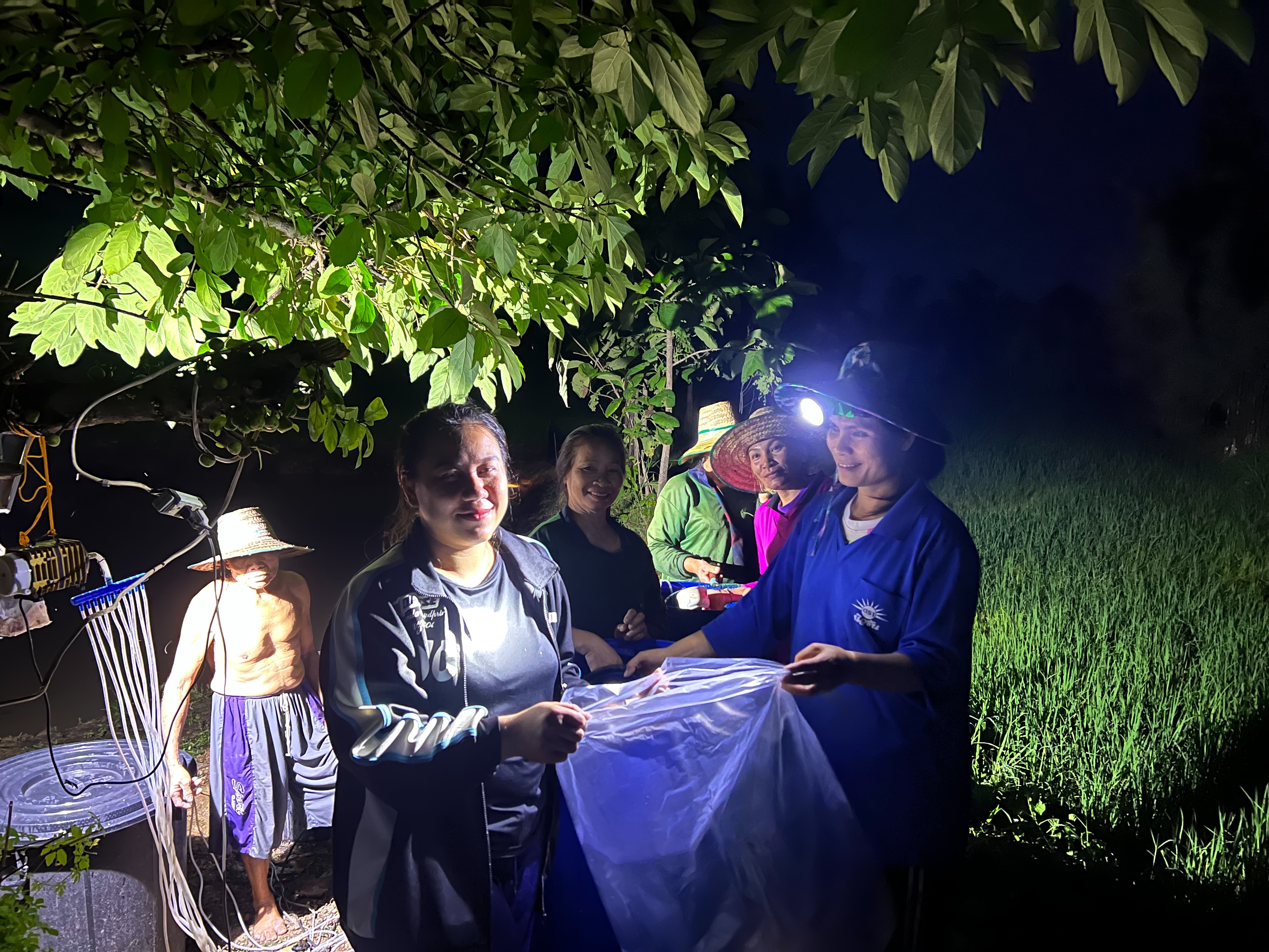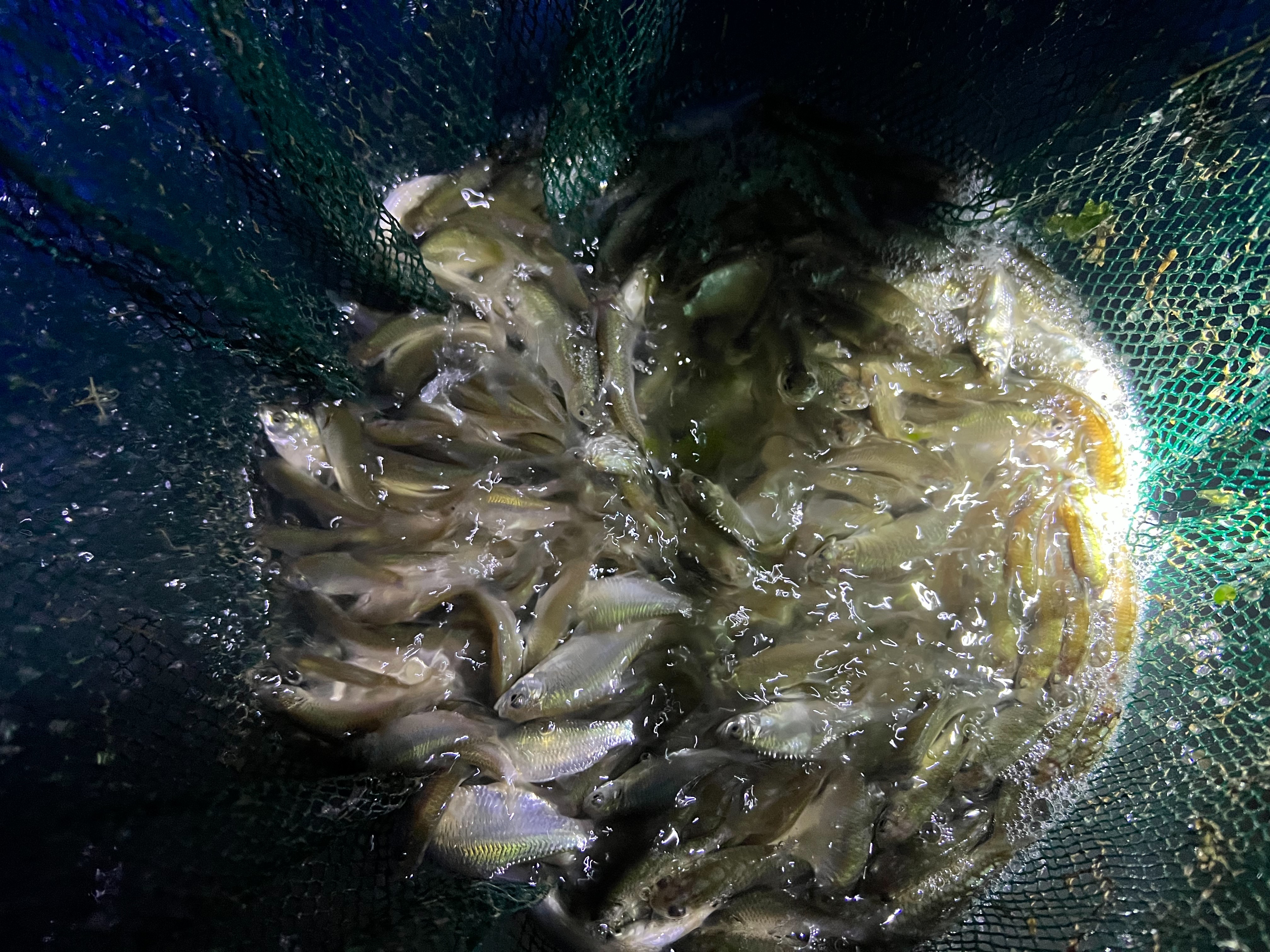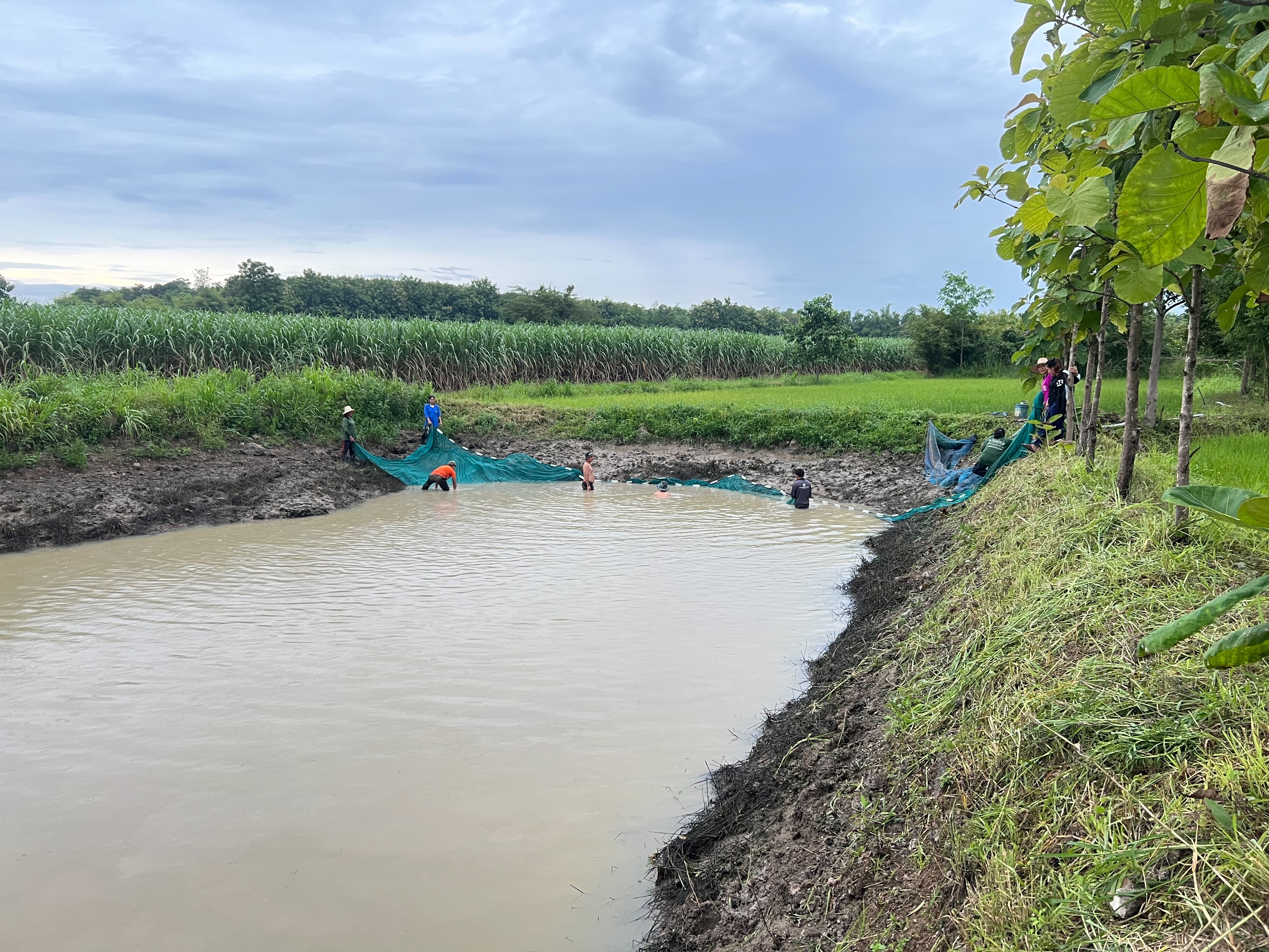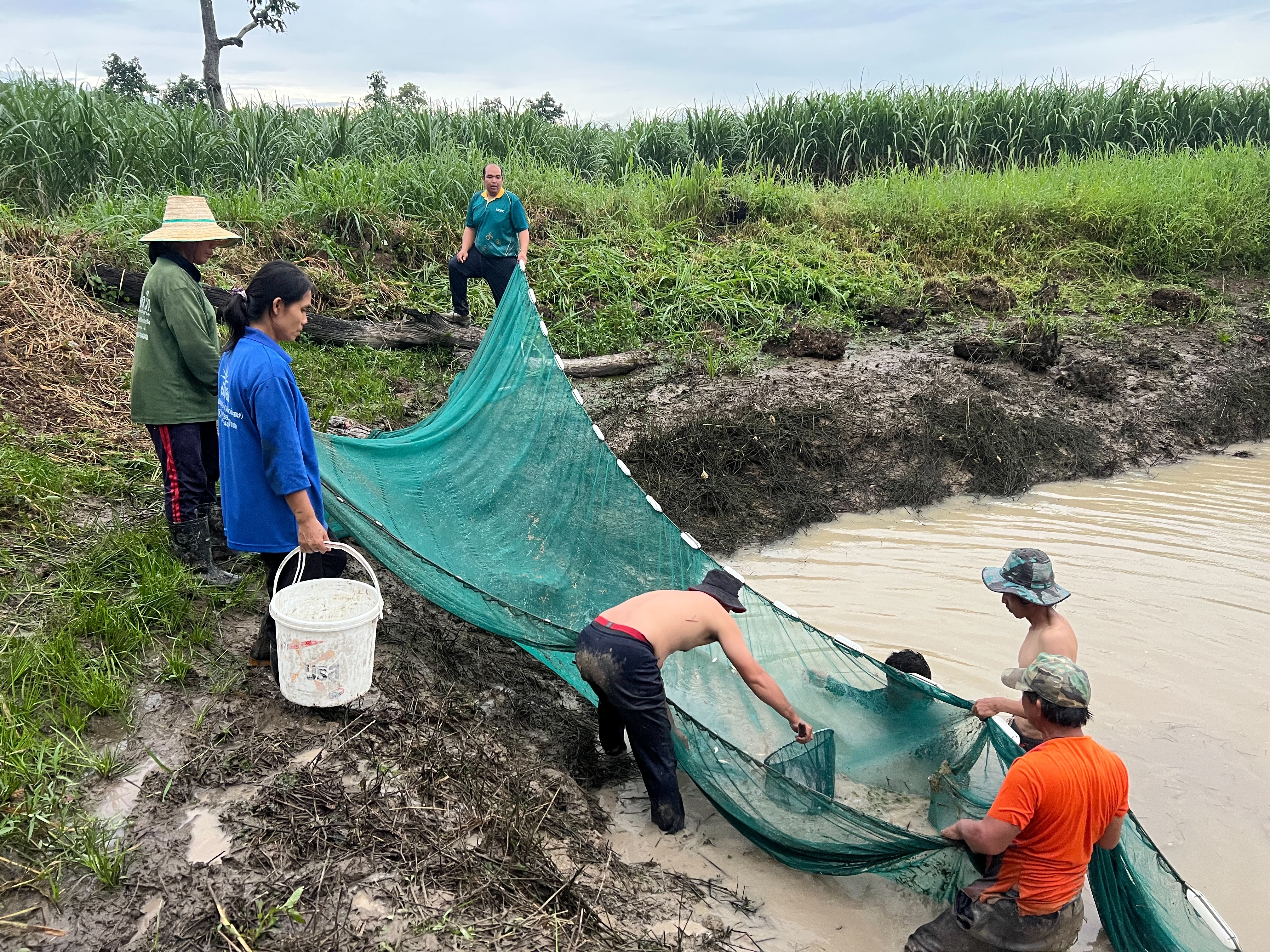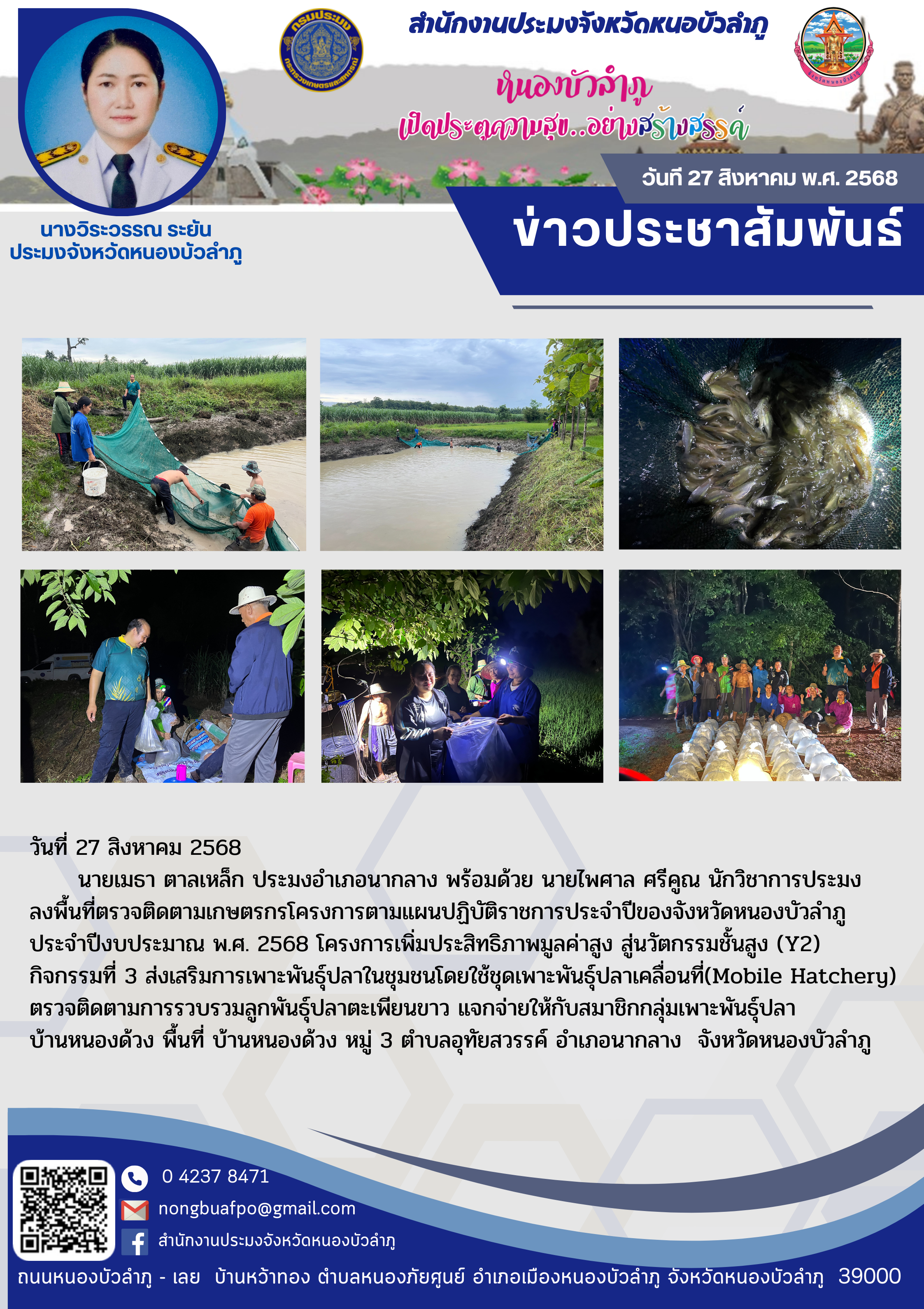 นายเมธา ตาลเหล็ก ประมงอำเภอนากลาง พร้อมด้วย นายไพศาล ศรีคูณ นักวิชาการประมง ลงพื้นที่ตรวจติดตามเกษตรกรโครงการตามแผนปฏิบัติราชการประจำปีของจังหวัดหนองบัวลำภู ประจำปีงบประมาณ พ.ศ. 2568 โครงการเพิ่มประสิทธิภาพมูลค่าสูง สู่นวัตกรรมชั้นสูง (Y2) กิจกรรมที่ 3 ส่งเสริมการเพาะพันธุ์ปลาในชุมชนโดยใช้ชุดเพาะพันธุ์ปลาเคลื่อนที่(Mobile Hatchery) ตรวจติดตามการรวบรวมลูกพันธุ์ปลาตะเพียนขาว แจกจ่ายให้กับสมาชิกกลุ่มเพาะพันธุ์ปลาบ้านหนองด้วง พื้นที่ บ้านหนองด้วง หมู่ 3 ตำบลอุทัยสวรรค์ อำเภอนากลาง จังหวัดหนองบัวลำภู