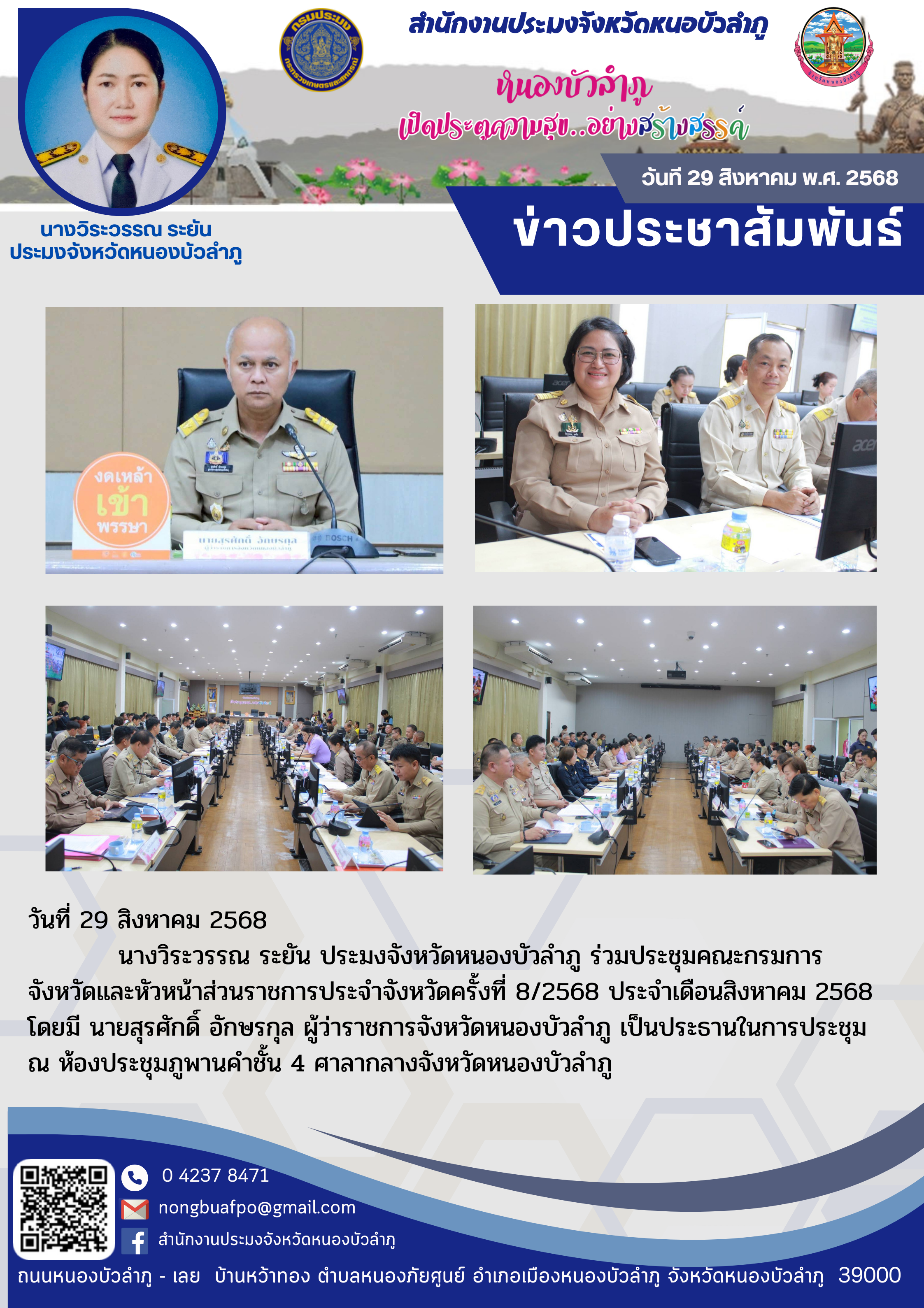 ร่วมประชุมคณะกรมการจังหวัดและหัวหน้าส่วนราชการประจำจังหวัดครั้งที่ 8/2568 ประจำเดือนสิงหาคม 2568