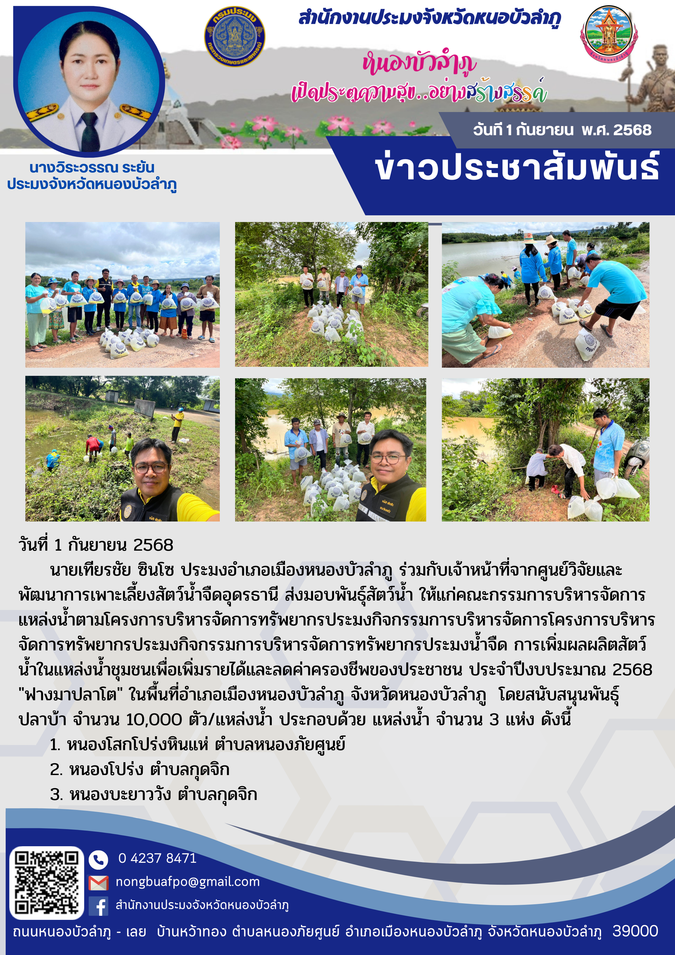นายเทียรชัย ซินโซ ประมงอำเภอเมืองหนองบัวลำภู ร่วมกับเจ้าหน้าที่จากศูนย์วิจัยและพัฒนาการเพาะเลี้ยงสัตว์น้ำจืดอุดรธานี ส่งมอบพันธุ์สัตว์น้ำ ให้แก่คณะกรรมการบริหารจัดการแหล่งน้ำตามโครงการบริหารจัดการทรัพยากรประมงกิจกรรมการบริหารจัดการโครงการบริหารจัดการทรัพยากรประมงกิจกรรมการบริหารจัดการทรัพยากรประมงน้ำจืด การเพิ่มผลผลิตสัตว์น้ำในแหล่งน้ำชุมชนเพื่อเพิ่มรายได้และลดค่าครองชีพของประชาชน ประจำปีงบประมาณ 2568 "ฟางมาปลาโต" ในพื้นที่อำเภอเมืองหนองบัวลำภู จังหวัดหนองบัวลำภู โดยสนับสนุนพันธุ์ ปลาบ้า จำนวน 10,000 ตัว/แหล่งน้ำ ประกอบด้วย แหล่งน้ำ จำนวน 3 แห่ง ดังนี้
