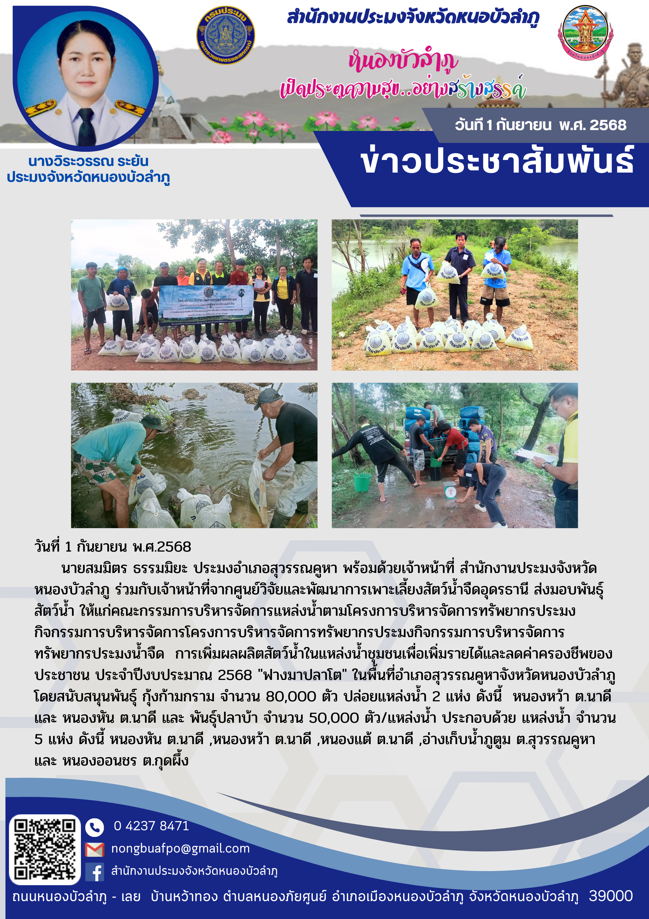 นายสมมิตร ธรรมมิยะ ประมงอำเภอสุวรรณคูหา พร้อมด้วยเจ้าหน้าที่ สำนักงานประมงจังหวัดหนองบัวลำภู ร่วมกับเจ้าหน้าที่จากศูนย์วิจัยและพัฒนาการเพาะเลี้ยงสัตว์น้ำจืดอุดรธานี ส่งมอบพันธุ์สัตว์น้ำ ให้แก่คณะกรรมการบริหารจัดการแหล่งน้ำตามโครงการบริหารจัดการทรัพยากรประมงกิจกรรมการบริหารจัดการโครงการบริหารจัดการทรัพยากรประมงกิจกรรมการบริหารจัดการทรัพยากรประมงน้ำจืด การเพิ่มผลผลิตสัตว์น้ำในแหล่งน้ำชุมชนเพื่อเพิ่มรายได้และลดค่าครองชีพของประชาชน ประจำปีงบประมาณ 2568 "ฟางมาปลาโต" ในพื้นที่อำเภอสุวรรณคูหาจังหวัดหนองบัวลำภู โดยสนับสนุนพันธุ์ กุ้งก้ามกราม จำนวน 80,000 ตัว ปล่อยแหล่งน้ำ 2 แห่ง ดังนี้ หนองหว้า ต.นาดี และ หนองหัน ต.นาดี และ พันธุ์ปลาบ้า จำนวน 50,000 ตัว/แหล่งน้ำ ประกอบด้วย แหล่งน้ำ จำนวน 5 แห่ง ดังนี้ หนองหัน ต.นาดี ,หนองหว้า ต.นาดี ,หนองแต้ ต.นาดี ,อ่างเก็บน้ำภูตูม ต.สุวรรณคูหา และ หนองออนชร ต.กุดผึ้ง