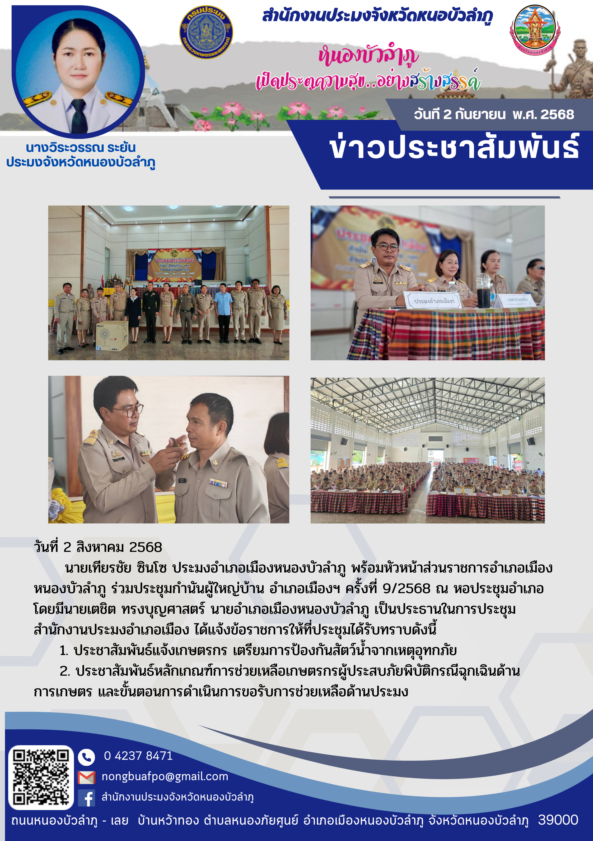 นายเทียรชัย ซินโซ ประมงอำเภอเมืองหนองบัวลำภู พร้อมหัวหน้าส่วนราชการอำเภอเมืองหนองบัวลำภู ร่วมประชุมกำนันผู้ใหญ่บ้าน อำเภอเมืองฯ ครั้งที่ 9/2568 ณ หอประชุมอำเภอ โดยมีนายเตชิต ทรงบุญศาสตร์ นายอำเภอเมืองหนองบัวลำภู เป็นประธานในการประชุม