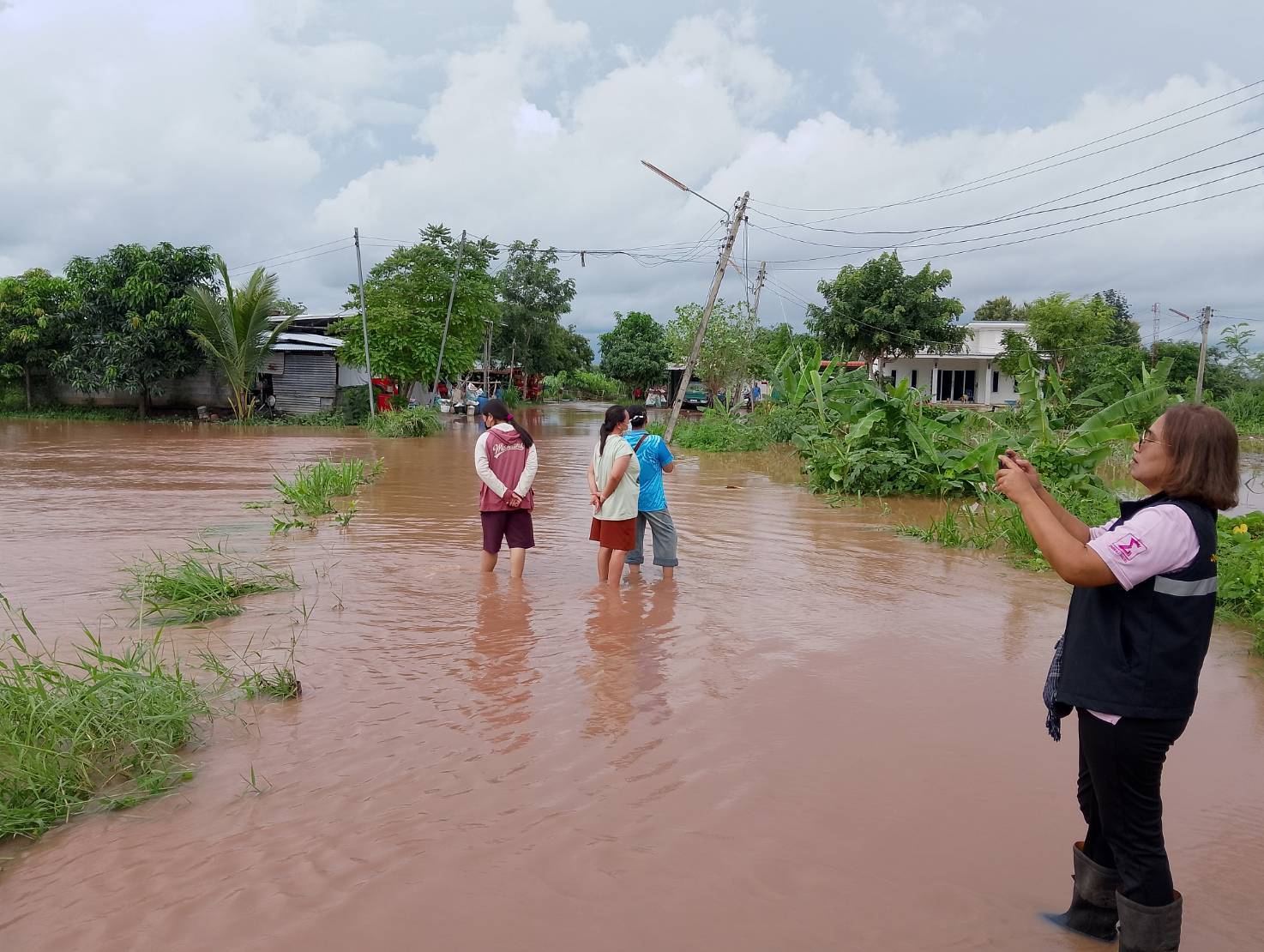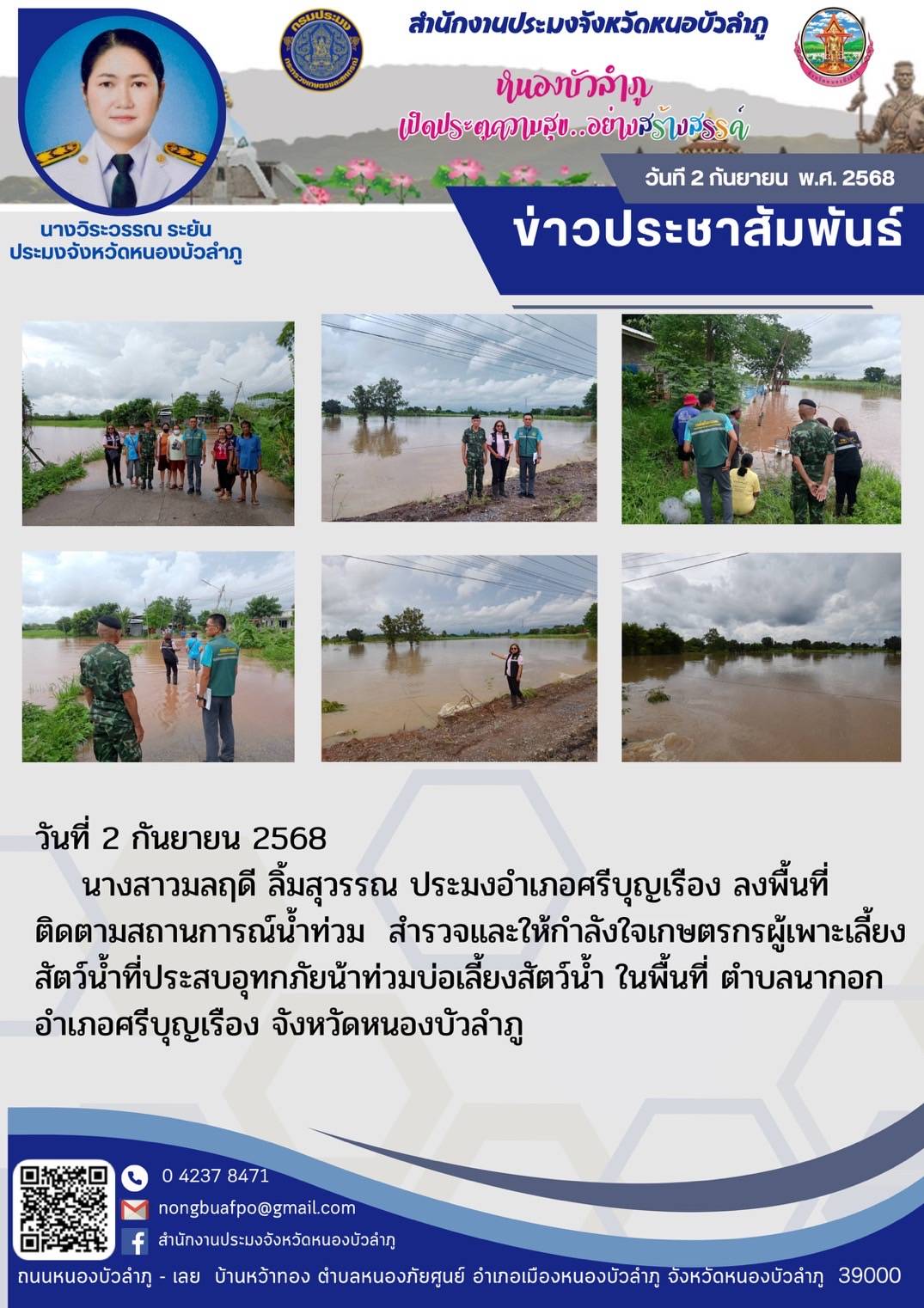 นางสาวมลฤดี ลิ้มสุวรรณ ประมงอำเภอศรีบุญเรือง ลงพื้นที่ติดตามสถานการณ์น้ำท่วม สำรวจและให้กำลังใจเกษตรกรผู้เพาะเลี้ยงสัตว์น้ำที่ประสบอุทกภัยน้าท่วมบ่อเลี้ยงสัตว์น้ำ ในพื้นที่ ตำบลนากอก อำเภอศรีบุญเรือง จังหวัดหนองบัวลำภู