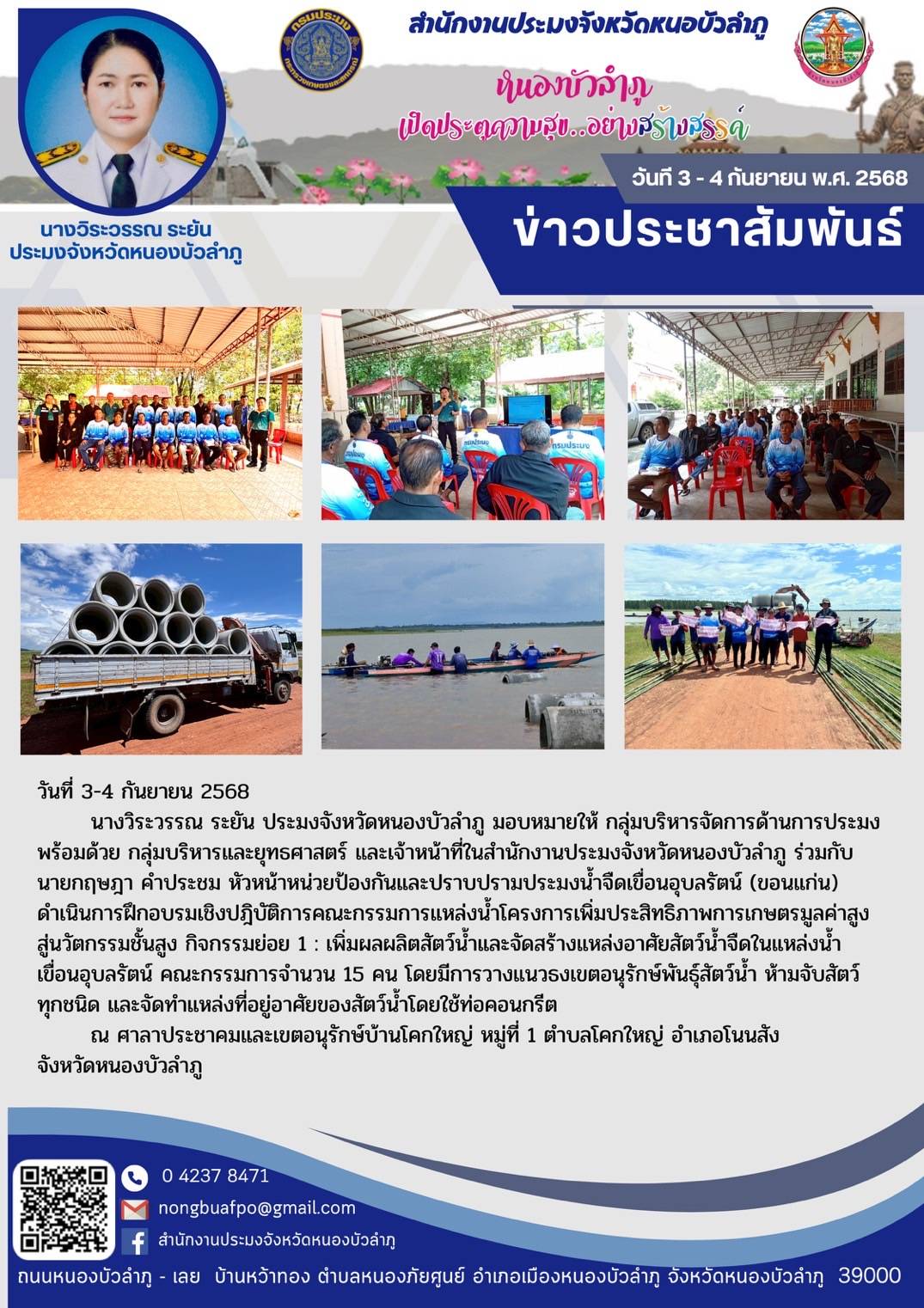 นางวิระวรรณ ระยัน ประมงจังหวัดหนองบัวลำภู มอบหมายให้ กลุ่มบริหารจัดการด้านการประมง พร้อมด้วย กลุ่มบริหารและยุทธศาสตร์ และเจ้าหน้าที่ในสำนักงานประมงจังหวัดหนองบัวลำภู ร่วมกับนายกฤษฎา คำประชม หัวหน้าหน่วยป้องกันและปราบปรามประมงน้ำจืดเขื่อนอุบลรัตน์ (ขอนแก่น) ดำเนินการฝึกอบรมเชิงปฎิบัติการคณะกรรมการแหล่งน้ำโครงการเพิ่มประสิทธิภาพการเกษตรมูลค่าสูง สู่นวัตกรรมชั้นสูง กิจกรรมย่อย 1 : เพิ่มผลผลิตสัตว์น้ำและจัดสร้างแหล่งอาศัยสัตว์น้ำจืดในแหล่งน้ำเขื่อนอุบลรัตน์ คณะกรรมการจำนวน 15 คน โดยมีการวางแนวธงเขตอนุรักษ์พันธุ์สัตว์น้ำ ห้ามจับสัตว์ทุกชนิด และจัดทำแหล่งที่อยู่อาศัยของสัตว์น้ำโดยใช้ท่อคอนกรีต ณ ศาลาประชาคมและเขตอนุรักษ์บ้านโคกใหญ่ หมู่ที่ 1 ตำบลโคกใหญ่ อำเภอโนนสัง จังหวัดหนองบัวลำภู