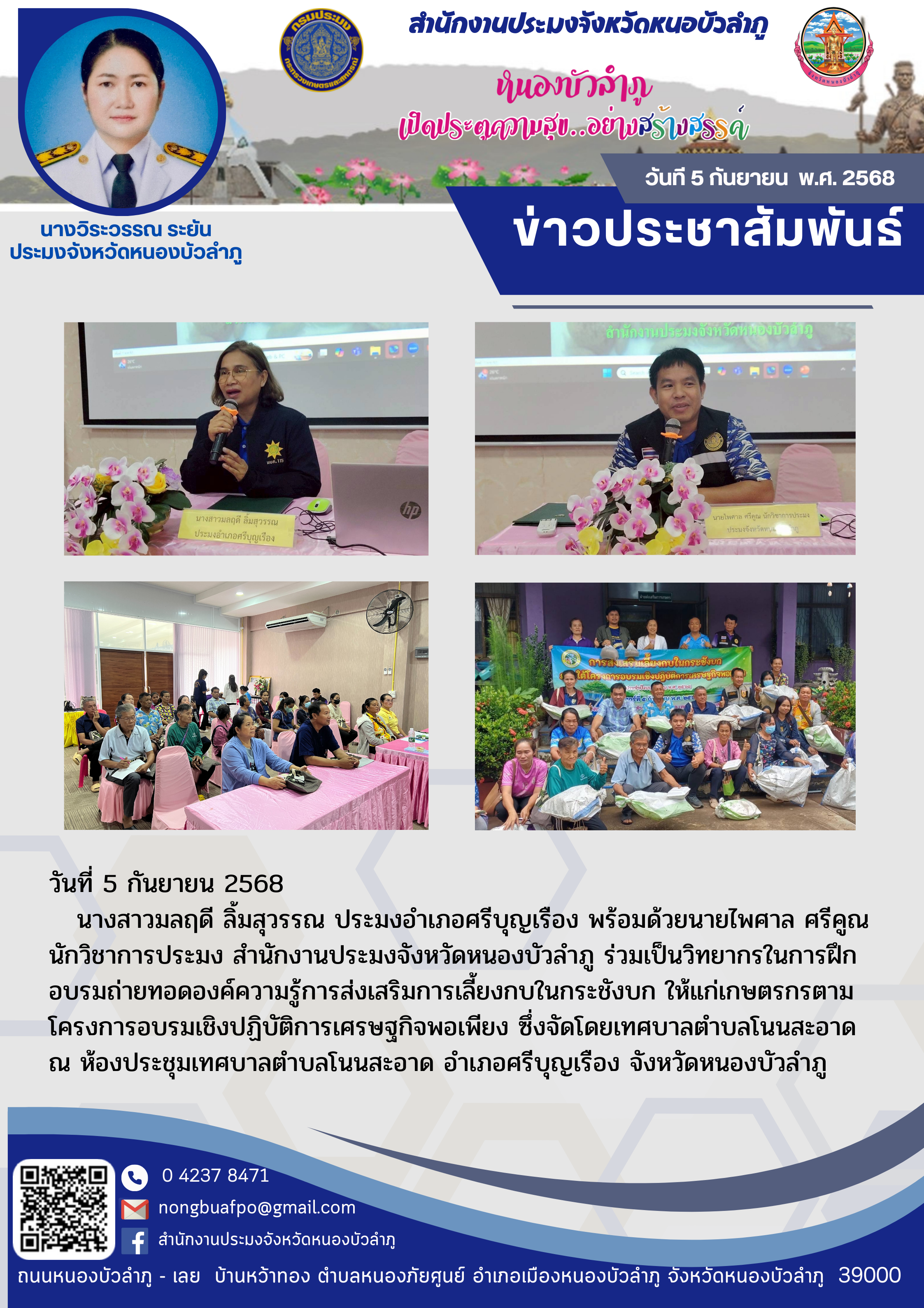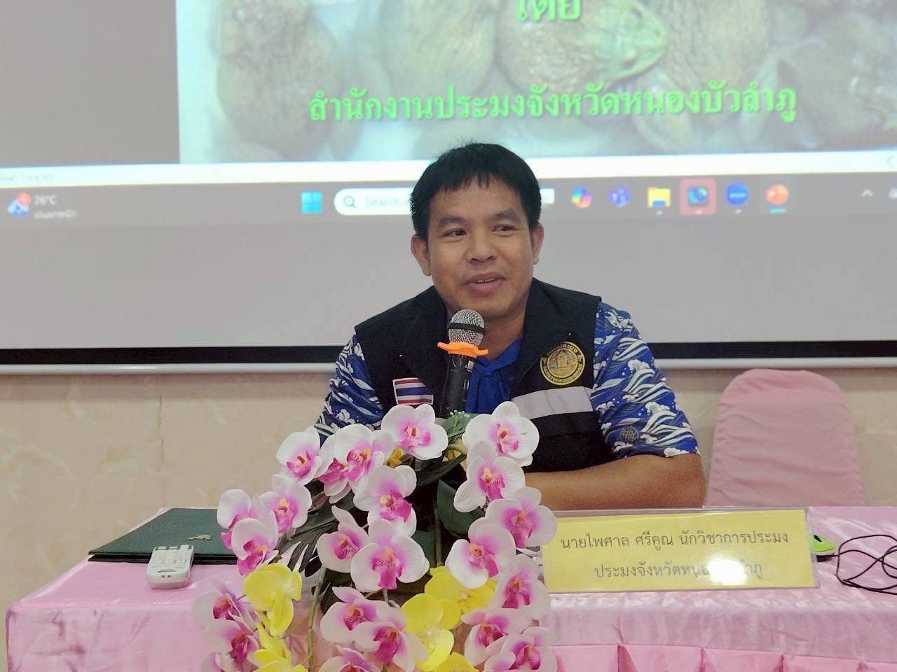 นางสาวมลฤดี ลิ้มสุวรรณ ประมงอำเภอศรีบุญเรือง พร้อมด้วยนายไพศาล ศรีคูณ นักวิชาการประมง สำนักงานประมงจังหวัดหนองบัวลำภู ร่วมเป็นวิทยากรในการฝึกอบรมถ่ายทอดองค์ความรู้การส่งเสริมการเลี้ยงกบในกระชังบก ให้แก่เกษตรกรตามโครงการอบรมเชิงปฏิบัติการเศรษฐกิจพอเพียง ซึ่งจัดโดยเทศบาลตำบลโนนสะอาด ณ ห้องประชุมเทศบาลตำบลโนนสะอาด อำเภอศรีบุญเรือง จังหวัดหนองบัวลำภู