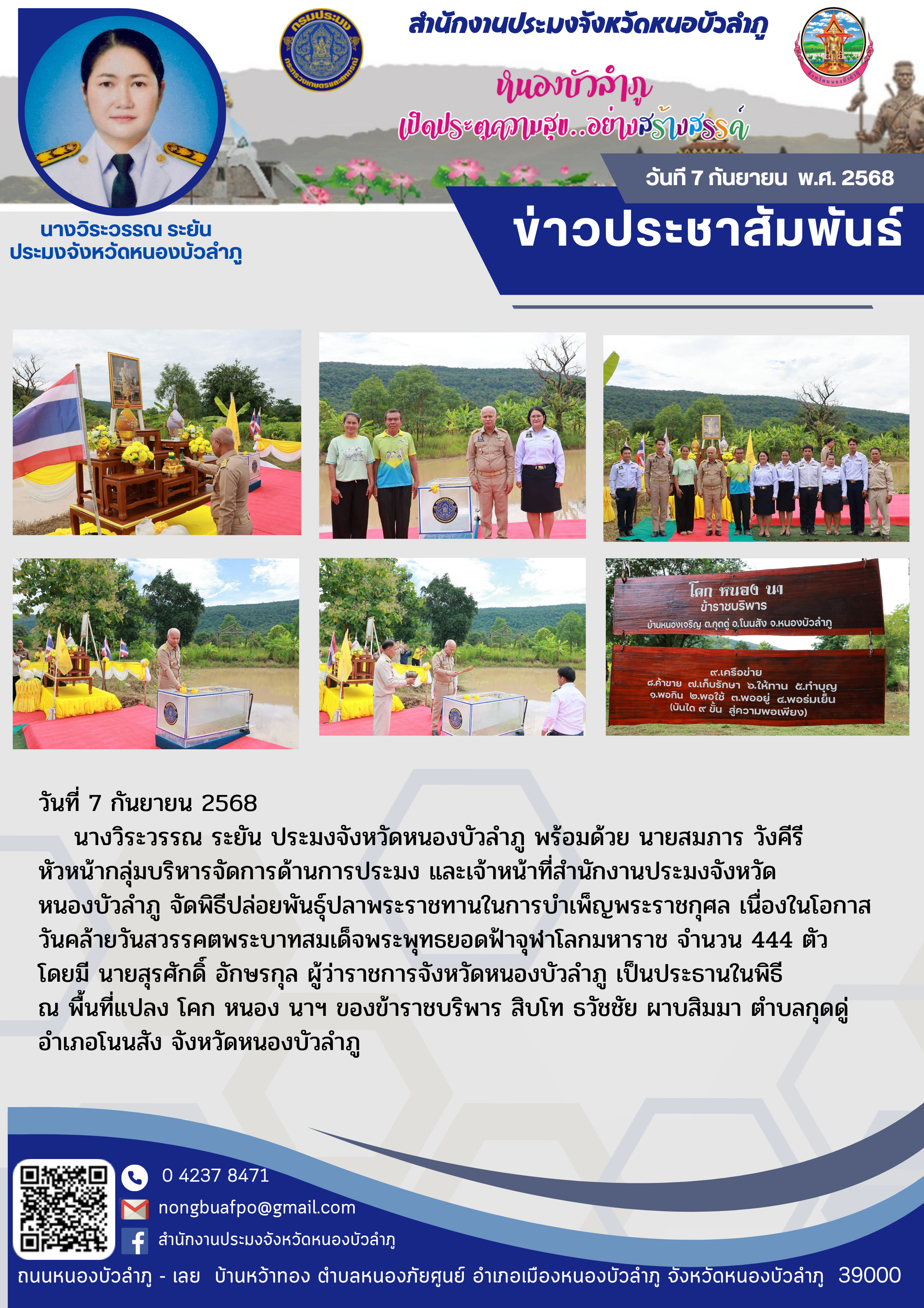 นางวิระวรรณ ระยัน ประมงจังหวัดหนองบัวลำภู พร้อมด้วย นายสมภาร วังคีรี หัวหน้ากลุ่มบริหารจัดการด้านการประมง และเจ้าหน้าที่สำนักงานประมงจังหวัดหนองบัวลำภู จัดพิธีปล่อยพันธ์ุปลาพระราชทานในการบำเพ็ญพระราชกุศล เนื่องในโอกาสวันคล้ายวันสวรรคตพระบาทสมเด็จพระพุทธยอดฟ้าจุฬาโลกมหาราช จำนวน 444 ตัว โดยมี นายสุรศักดิ์ อักษรกุล ผู้ว่าราชการจังหวัดหนองบัวลำภู เป็นประธานในพิธี ณ พื้นที่แปลง โคก หนอง นาฯ ของข้าราชบริพาร สิบโท ธวัชชัย ผาบสิมมา ตำบลกุดดู่ อำเภอโนนสัง จังหวัดหนองบัวลำภู