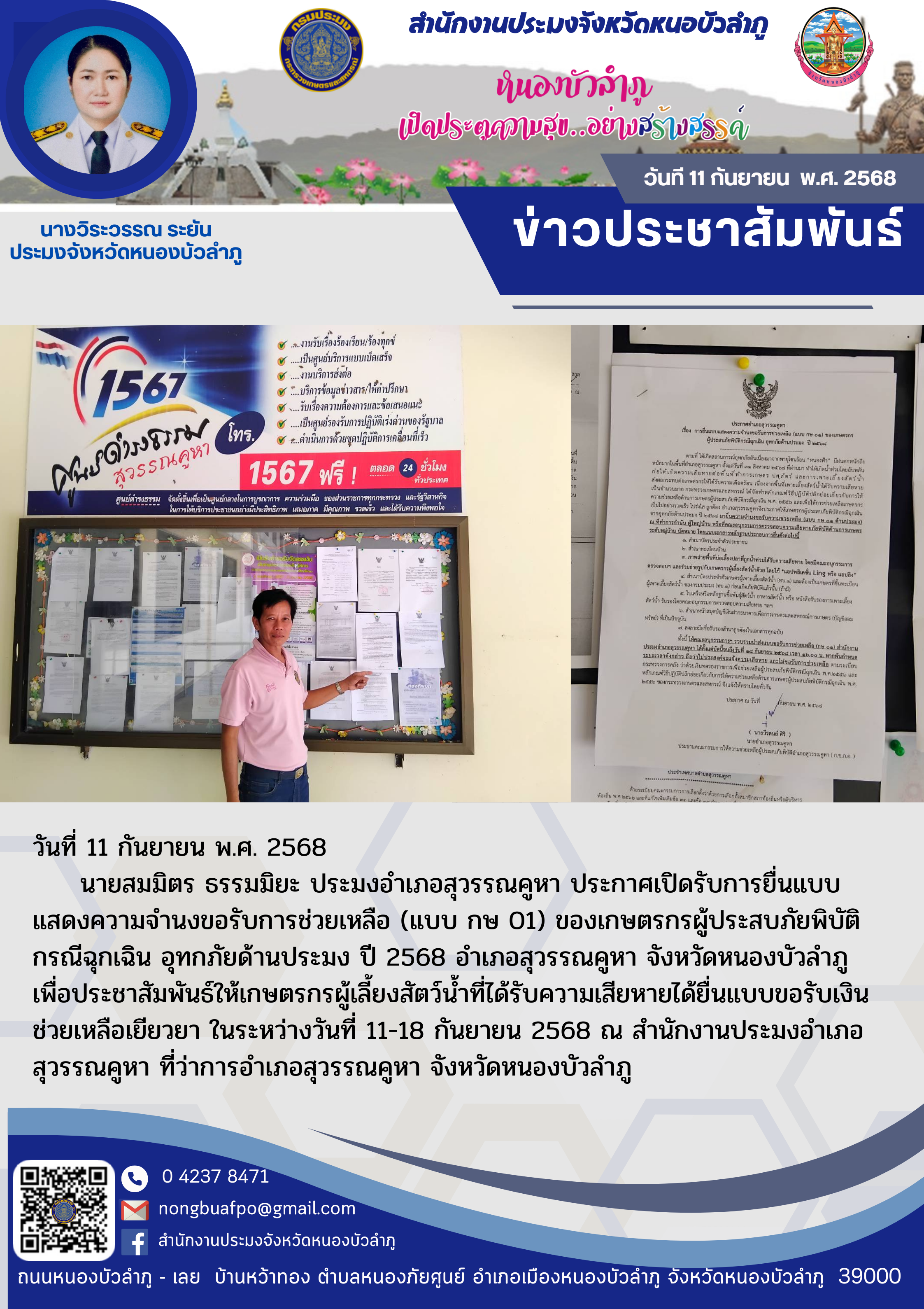 นายสมมิตร ธรรมมิยะ ประมงอำเภอสุวรรณคูหา ประกาศเปิดรับการยื่นแบบแสดงความจำนงขอรับการช่วยเหลือ (แบบ กษ 01) ของเกษตรกรผู้ประสบภัยพิบัติกรณีฉุกเฉิน อุทกภัยด้านประมง ปี 2568 อำเภอสุวรรณคูหา จังหวัดหนองบัวลำภู เพื่อประชาสัมพันธ์ให้เกษตรกรผู้เลี้ยงสัตว์น้ำที่ได้รับความเสียหายได้ยื่นแบบขอรับเงินช่วยเหลือเยียวยา ในระหว่างวันที่ 11-18 กันยายน 2568 ณ สำนักงานประมงอำเภอสุวรรณคูหา ที่ว่าการอำเภอสุวรรณคูหา จังหวัดหนองบัวลำภู