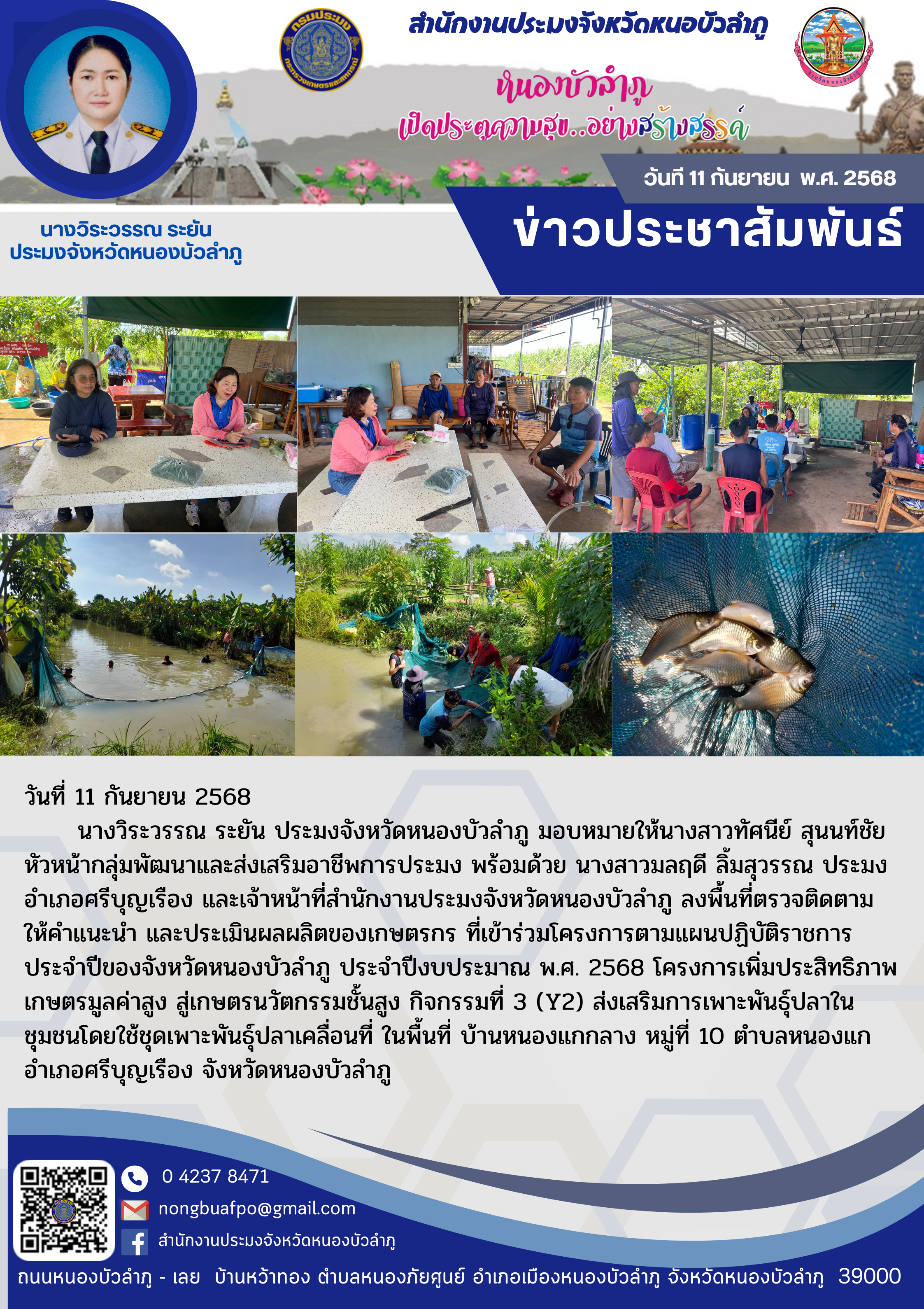 นางวิระวรรณ ระยัน ประมงจังหวัดหนองบัวลำภู มอบหมายให้นางสาวทัศนีย์ สุนนท์ชัย หัวหน้ากลุ่มพัฒนาและส่งเสริมอาชีพการประมง พร้อมด้วย นางสาวมลฤดี ลิ้มสุวรรณ ประมงอำเภอศรีบุญเรือง และเจ้าหน้าที่สำนักงานประมงจังหวัดหนองบัวลำภู ลงพื้นที่ตรวจติดตาม ให้คำแนะนำ และประเมินผลผลิตของเกษตรกร ที่เข้าร่วมโครงการตามแผนปฏิบัติราชการประจำปีของจังหวัดหนองบัวลำภู ประจำปีงบประมาณ พ.ศ. 2568 โครงการเพิ่มประสิทธิภาพเกษตรมูลค่าสูง สู่เกษตรนวัตกรรมชั้นสูง กิจกรรมที่ 3 (Y2) ส่งเสริมการเพาะพันธุ์ปลาในชุมชนโดยใช้ชุดเพาะพันธุ์ปลาเคลื่อนที่ ในพื้นที่ บ้านหนองแกกลาง หมู่ที่ 10 ตำบลหนองแก อำเภอศรีบุญเรือง จังหวัดหนองบัวลำภู