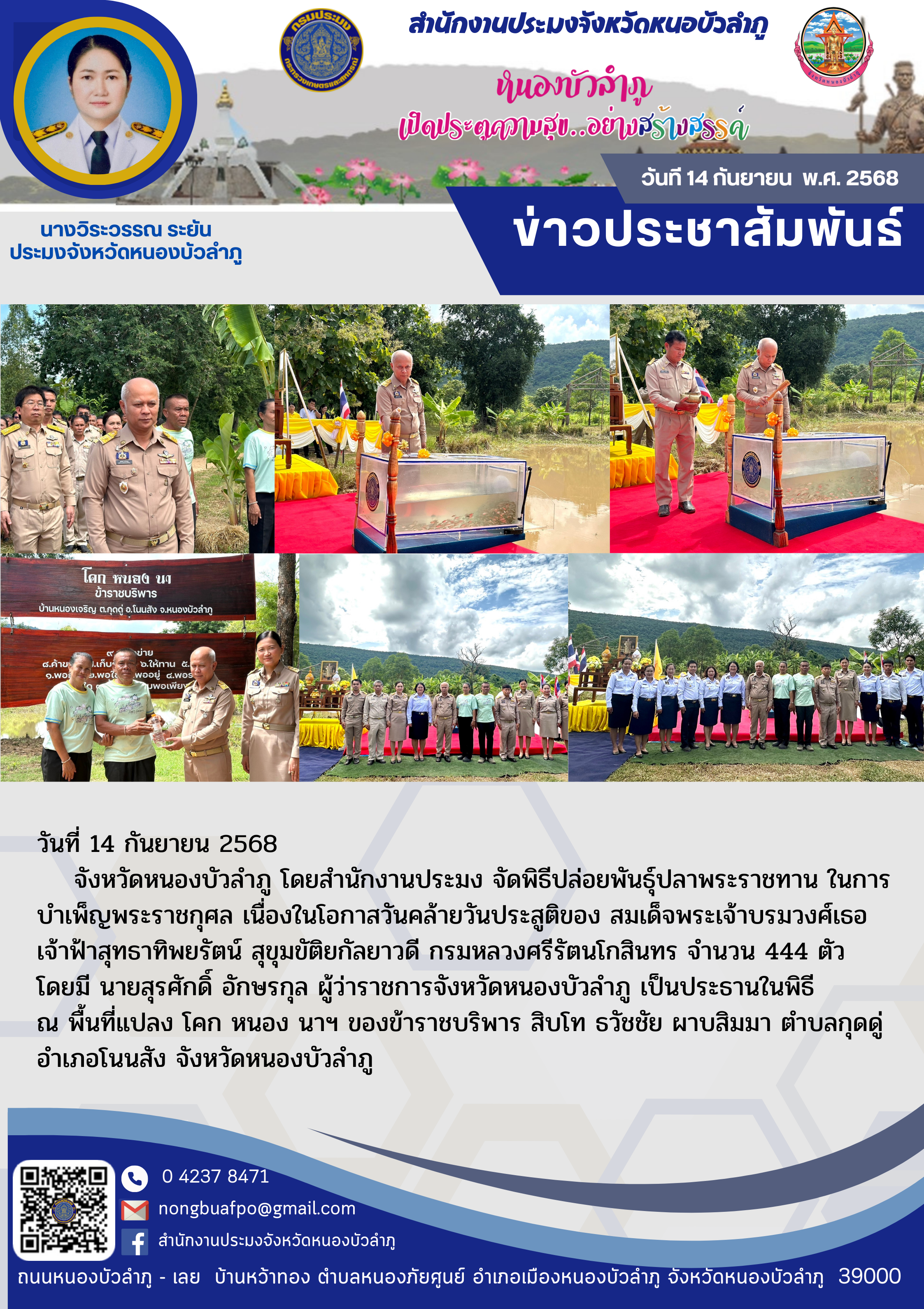 จังหวัดหนองบัวลำภู โดยสำนักงานประมง จัดพิธีปล่อยพันธ์ุปลาพระราชทาน ในการบำเพ็ญพระราชกุศล เนื่องในโอกาสวันคล้ายวันประสูติของ สมเด็จพระเจ้าบรมวงศ์เธอ เจ้าฟ้าสุทธาทิพยรัตน์ สุขุมขัติยกัลยาวดี กรมหลวงศรีรัตนโกสินทร จำนวน 444 ตัว โดยมี นายสุรศักดิ์ อักษรกุล ผู้ว่าราชการจังหวัดหนองบัวลำภู เป็นประธานในพิธี ณ พื้นที่แปลง โคก หนอง นาฯ ของข้าราชบริพาร สิบโท ธวัชชัย ผาบสิมมา ตำบลกุดดู่ อำเภอโนนสัง จังหวัดหนองบัวลำภู