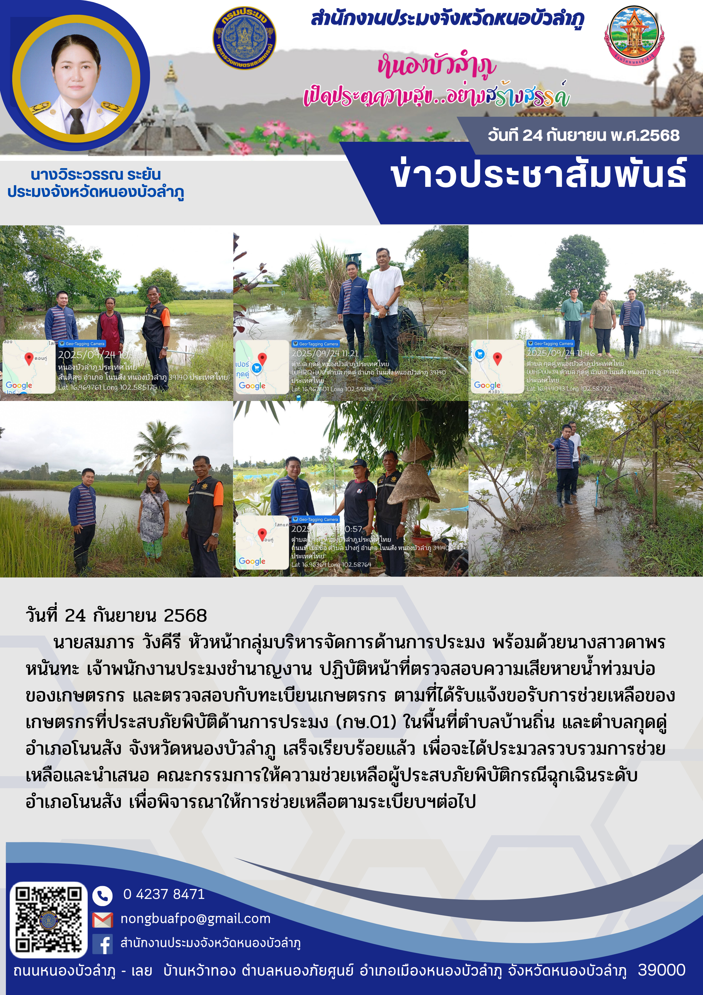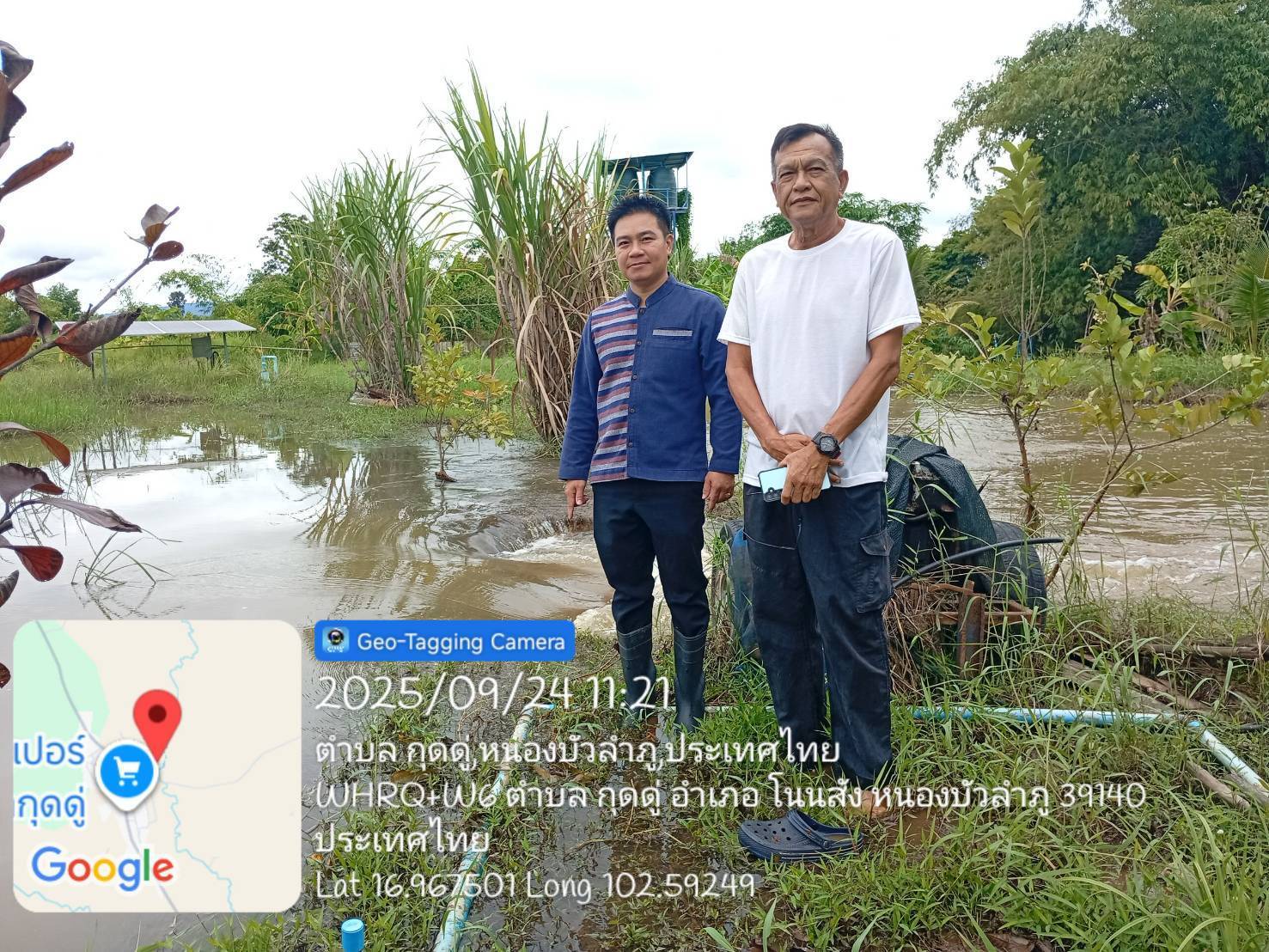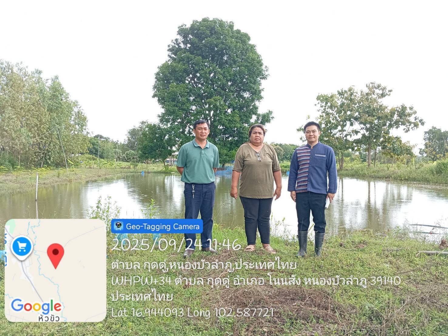 นายสมภาร วังคีรี หัวหน้ากลุ่มบริหารจัดการด้านการประมง พร้อมด้วยนางสาวดาพร หนันทะ เจ้าพนักงานประมงชำนาญงาน ปฏิบัติหน้าที่ตรวจสอบความเสียหายน้ำท่วมบ่อของเกษตรกร และตรวจสอบกับทะเบียนเกษตรกร ตามที่ได้รับแจ้งขอรับการช่วยเหลือของเกษตรกรที่ประสบภัยพิบัติด้านการประมง (กษ.01) ในพื้นที่ตำบลบ้านถิ่น และตำบลกุดดู่ อำเภอโนนสัง จังหวัดหนองบัวลำภู เสร็จเรียบร้อยแล้ว เพื่อจะได้ประมวลรวบรวมการช่วยเหลือและนำเสนอ คณะกรรมการให้ความช่วยเหลือผู้ประสบภัยพิบัติกรณีฉุกเฉินระดับอำเภอโนนสัง เพื่อพิจารณาให้การช่วยเหลือตามระเบียบฯต่อไป