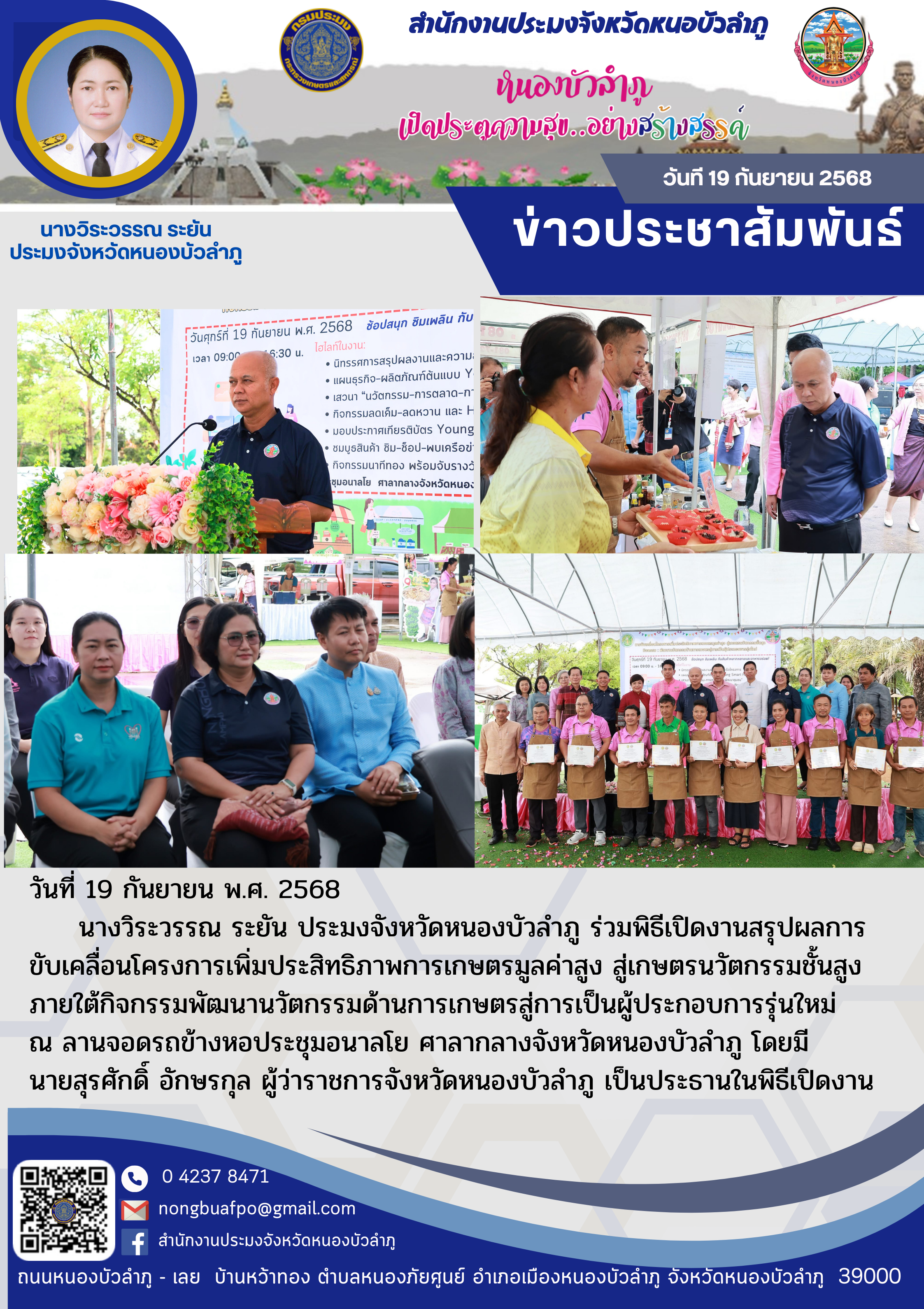 นางวิระวรรณ ระยัน ประมงจังหวัดหนองบัวลำภู ร่วมพิธีเปิดงานสรุปผลการขับเคลื่อนโครงการเพิ่มประสิทธิภาพการเกษตรมูลค่าสูง สู่เกษตรนวัตกรรมชั้นสูง ภายใต้กิจกรรมพัฒนานวัตกรรมด้านการเกษตรสู่การเป็นผู้ประกอบการรุ่นใหม่ ณ ลานจอดรถข้างหอประชุมอนาลโย ศาลากลางจังหวัดหนองบัวลำภู โดยมี นายสุรศักดิ์ อักษรกุล ผู้ว่าราชการจังหวัดหนองบัวลำภู เป็นประธานในพิธีเปิดงาน