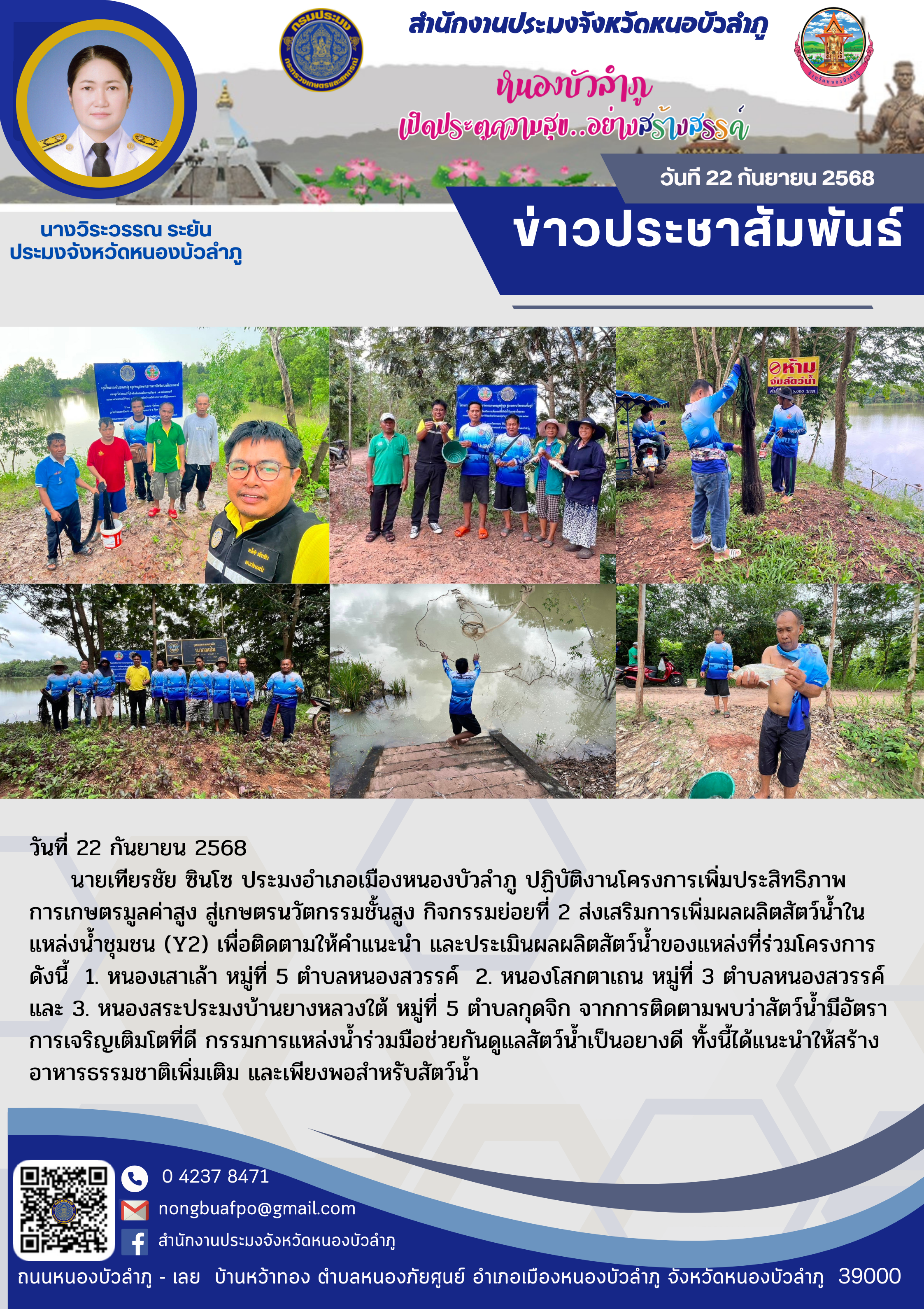 นายเทียรชัย ซินโซ ประมงอำเภอเมืองหนองบัวลำภู ปฏิบัติงานโครงการเพิ่มประสิทธิภาพการเกษตรมูลค่าสูง สู่เกษตรนวัตกรรมชั้นสูง กิจกรรมย่อยที่ 2 ส่งเสริมการเพิ่มผลผลิตสัตว์น้ำในแหล่งน้ำชุมชน (Y2) เพื่อติดตามให้คำแนะนำ และประเมินผลผลิตสัตว์น้ำของแหล่งที่ร่วมโครงการดังนี้ 1. หนองเสาเล้า หมู่ที่ 5 ตำบลหนองสวรรค์ 2. หนองโสกตาเถน หมู่ที่ 3 ตำบลหนองสวรรค์ และ 3. หนองสระประมงบ้านยางหลวงใต้ หมู่ที่ 5 ตำบลกุดจิก จากการติดตามพบว่าสัตว์น้ำมีอัตราการเจริญเติมโตที่ดี กรรมการแหล่งน้ำร่วมมือช่วยกันดูแลสัตว์น้ำเป็นอยางดี ทั้งนี้ได้แนะนำให้สร้างอาหารธรรมชาติเพิ่มเติม และเพียงพอสำหรับสัตว์น้ำ