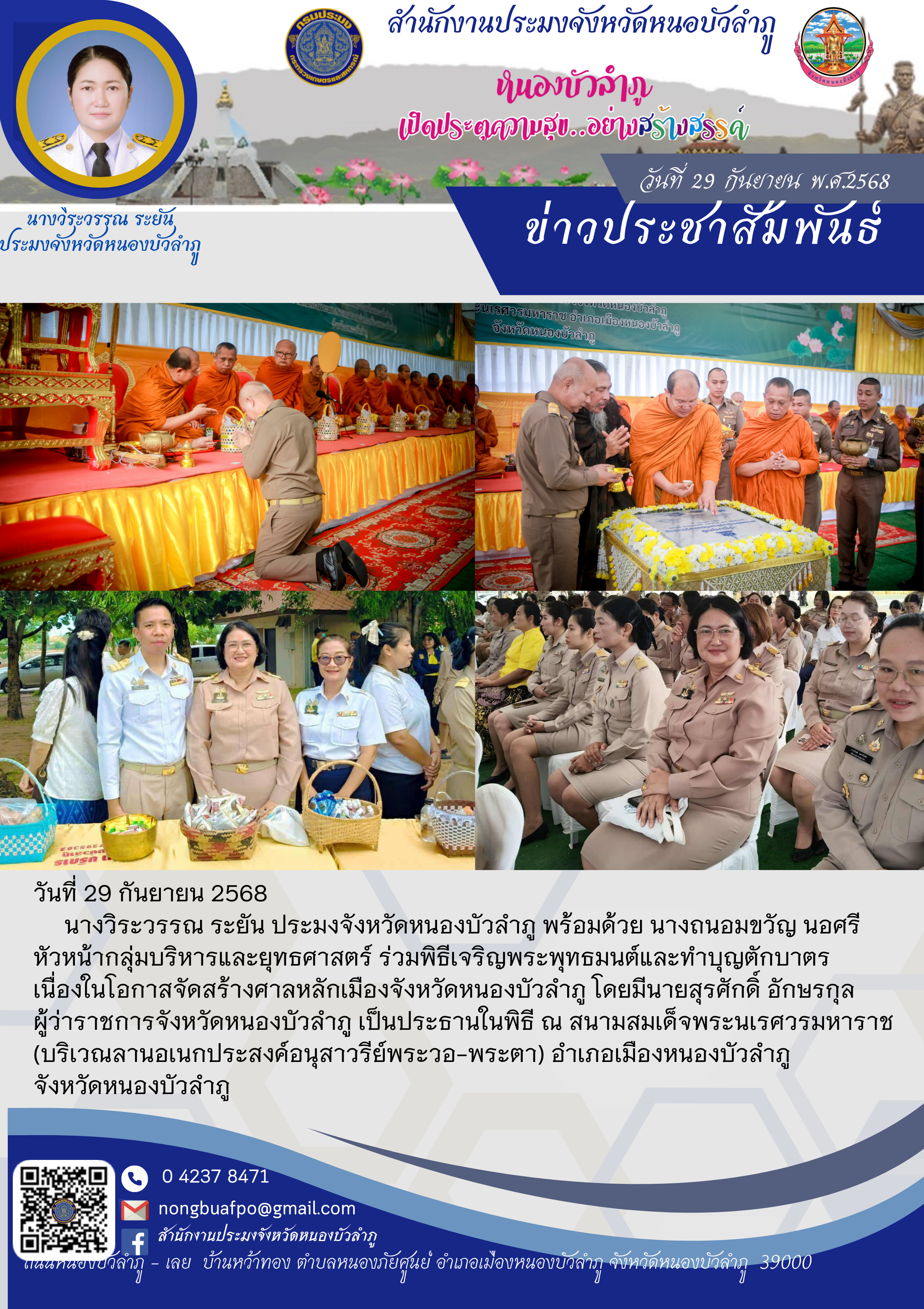 ร่วมพิธีเจริญพระพุทธมนต์และทำบุญตักบาตร เนื่องในโอกาสจัดสร้างศาลหลักเมืองจังหวัดหนองบัวลำภู