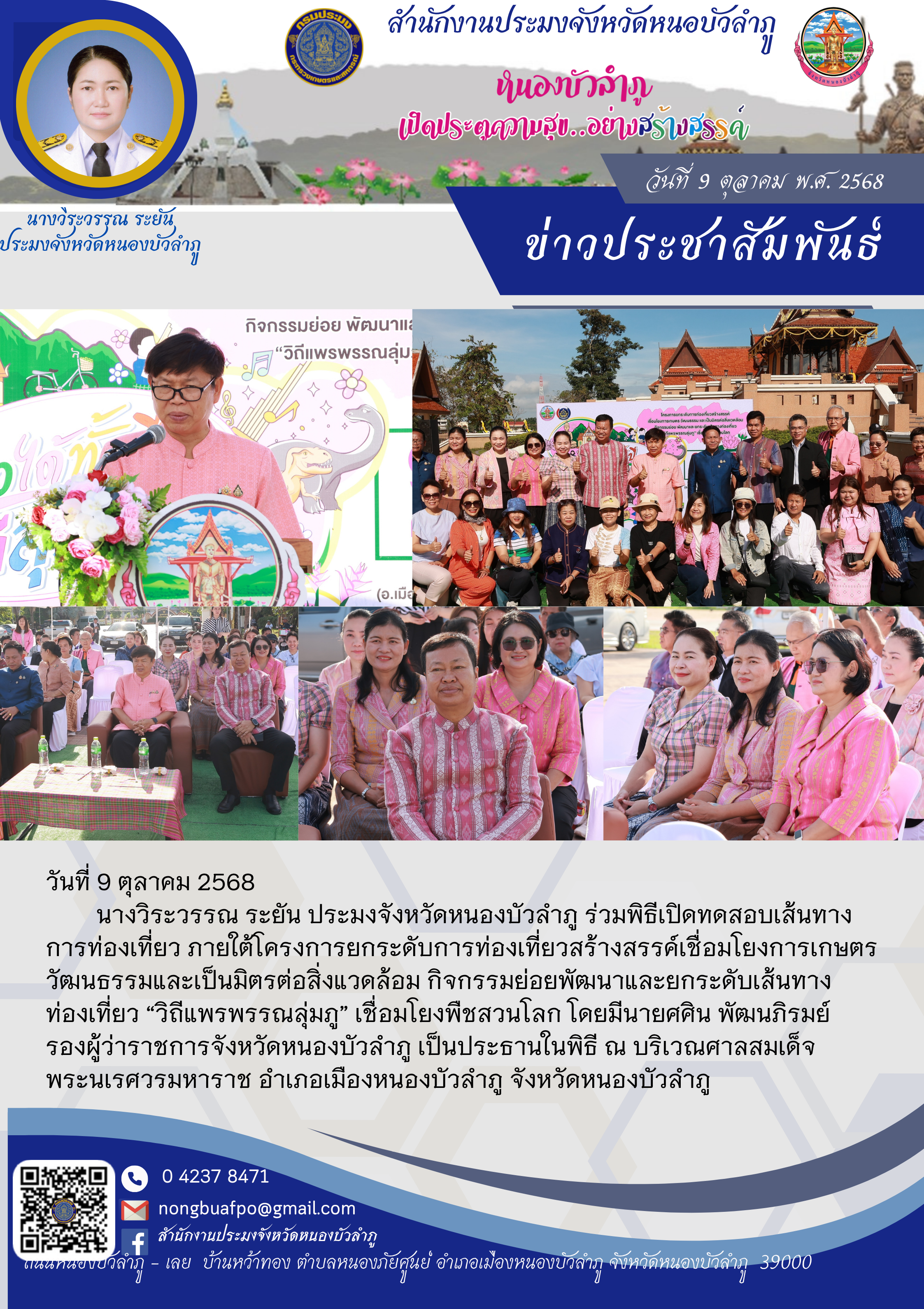 นางวิระวรรณ ระยัน ประมงจังหวัดหนองบัวลำภู ร่วมพิธีเปิดทดสอบเส้นทางการท่องเที่ยว ภายใต้โครงการยกระดับการท่องเที่ยวสร้างสรรค์เชื่อมโยงการเกษตร วัฒนธรรมและเป็นมิตรต่อสิ่งแวดล้อม กิจกรรมย่อยพัฒนาและยกระดับเส้นทางท่องเที่ยว “วิถีแพรพรรณลุ่มภู” เชื่อมโยงพืชสวนโลก โดยมีนายศศิน พัฒนภิรมย์ รองผู้ว่าราชการจังหวัดหนองบัวลำภู เป็นประธานในพิธี ณ บริเวณศาลสมเด็จ พระนเรศวรมหาราช อำเภอเมืองหนองบัวลำภู จังหวัดหนองบัวลำภู