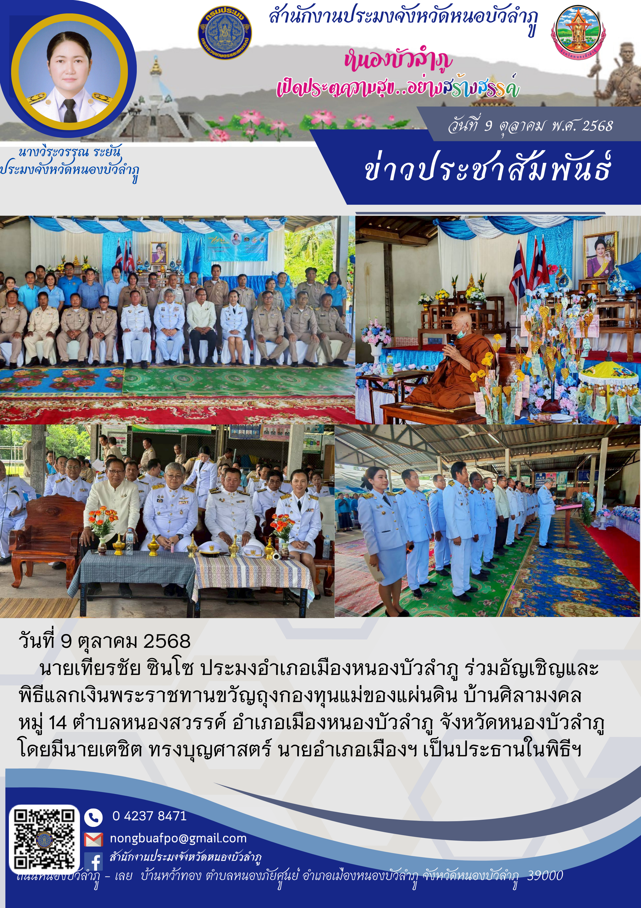 [2025-11-07] ร่วมประชุมประจำเดือน กำนัน ผู้ใหญ่บ้าน อำเภอโนนสัง ครั้งที่ 11/2568 ณ.. [2025-11-07] ปฎิบัติงานคัดเลือกเกษตรกรเข้าร่วมโครงการพัฒนาเกษตรกรรมยั่งยืน กิจกรรมพ.. [2025-11-06] ร่วมโครงการฝึกอบรมเชิงปฏิบัติการเพื่อส่งเสริมสร้างสมรรถนะด้านบัญชีภาค.. [2025-11-05] ร่วมประชุมคณะทำงานขับเคลื่อนการพัฒนาเศรษฐกิจฐานรากและประชารัฐ (E3) จัง.. [2025-11-04] ร่วมจัดรายการวิทยุ "รายการ รอบบ้านเมืองหนองบัว" โดยทำการจัดรายการวิทยุ.. [2025-11-04] ร่วมพิธีทอดกฐินพระราชทาน ประจำปีพุทธศักราช 2568.. [2025-11-04] ร่วมพิธียกยอดฉัตรกางกั้นองค์พระประธานในพระอุโบสถ และพิธีสมโภชองค์พระกฐ.. [2025-11-04] ร่วมปล่อยพันธุ์ปลา เพื่อถวายเป็นพระราชกุศลและสร้างจิตสำนึกในการอนุรักษ.. [2025-11-04] ปฎิบัติงานคัดเลือกเกษตรกรเข้าร่วมโครงการพัฒนาเกษตรกรรมยั่งยืน กิจกรรมพ.. [2025-11-03] ร่วมประชุม หัวหน้าส่วนราชการ หัวหน้าหน่วยงานรัฐวิสาหกิจ ผู้บริหารองค์ก.. อ่านทั้งหมด