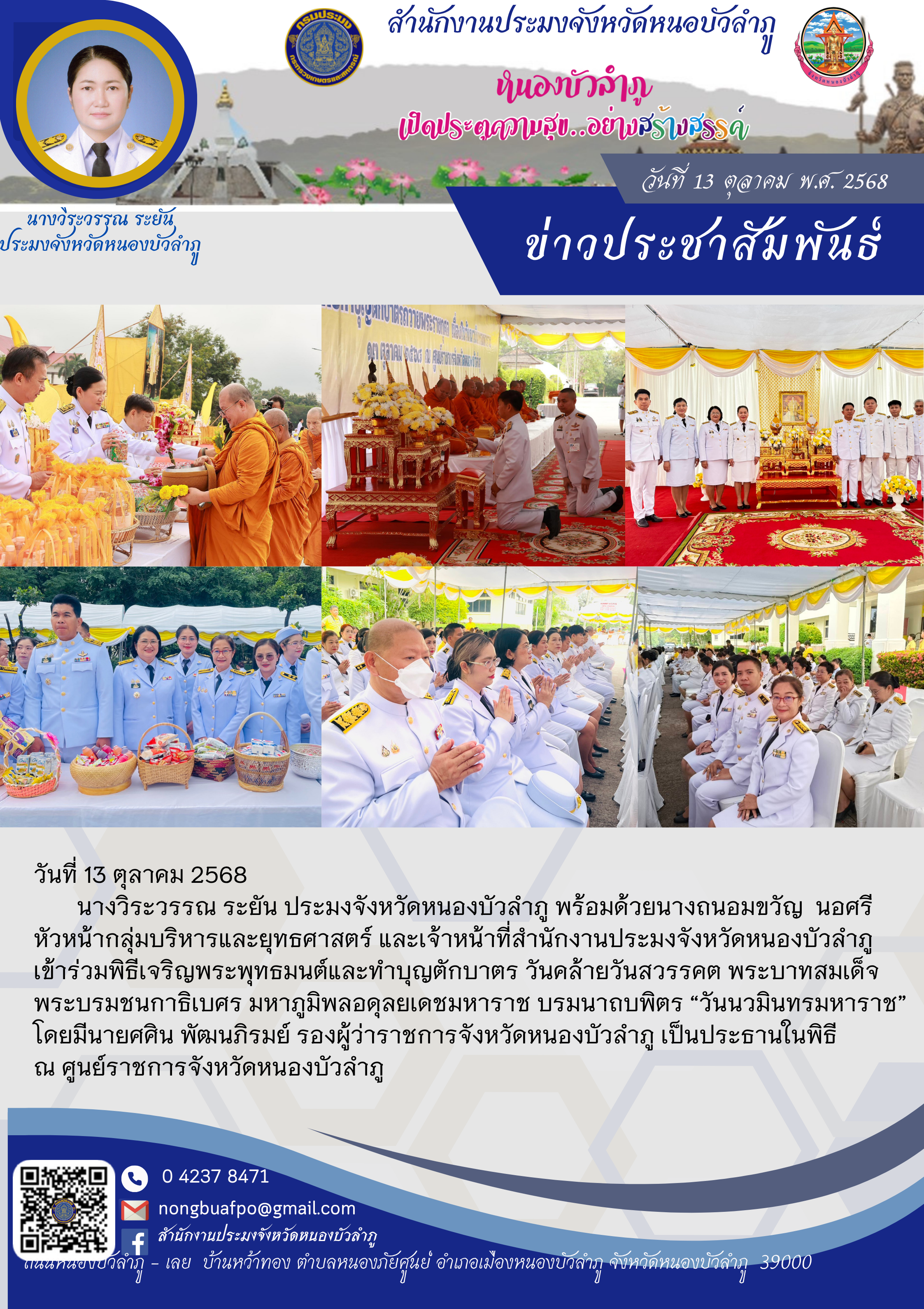 นางวิระวรรณ ระยัน ประมงจังหวัดหนองบัวลำภู พร้อมด้วยนางถนอมขวัญ นอศรี หัวหน้ากลุ่มบริหารและยุทธศาสตร์ และเจ้าหน้าที่สำนักงานประมงจังหวัดหนองบัวลำภู เข้าร่วมพิธีเจริญพระพุทธมนต์และทำบุญตักบาตร วันคล้ายวันสวรรคต พระบาทสมเด็จพระบรมชนกาธิเบศร มหาภูมิพลอดุลยเดชมหาราช บรมนาถบพิตร “วันนวมินทรมหาราช” โดยมีนายศศิน พัฒนภิรมย์ รองผู้ว่าราชการจังหวัดหนองบัวลำภู เป็นประธานในพิธี ณ ศูนย์ราชการจังหวัดหนองบัวลำภู