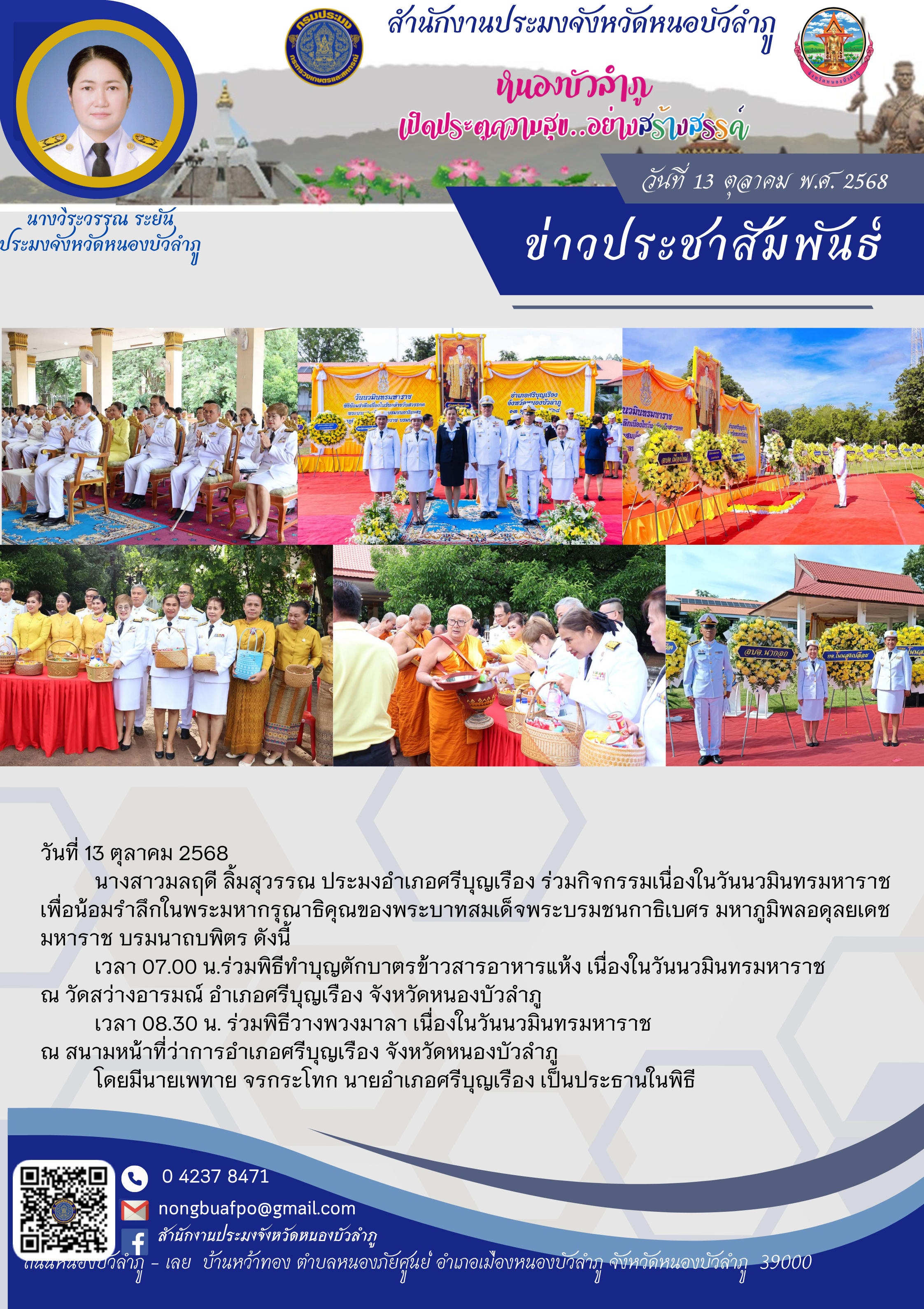 เวลา 07.00 น.ร่วมพิธีทำบุญตักบาตรข้าวสารอาหารแห้ง เนื่องในวันนวมินทรมหาราช ณ วัดสว่างอารมณ์ อำเภอศรีบุญเรือง จังหวัดหนองบัวลำภู