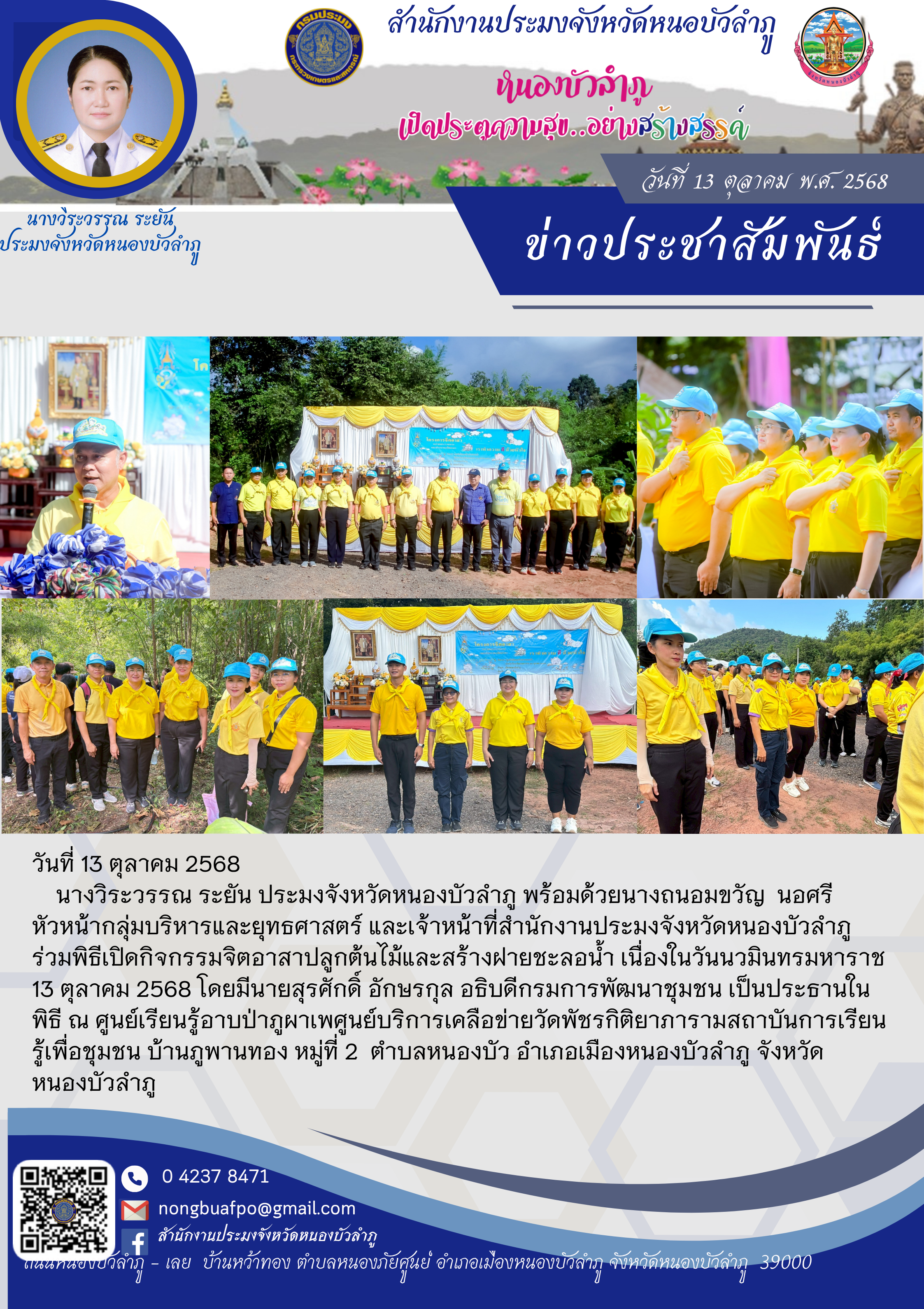 นางวิระวรรณ ระยัน ประมงจังหวัดหนองบัวลำภู พร้อมด้วยนางถนอมขวัญ นอศรี หัวหน้ากลุ่มบริหารและยุทธศาสตร์ และเจ้าหน้าที่สำนักงานประมงจังหวัดหนองบัวลำภู ร่วมพิธีเปิดกิจกรรมจิตอาสาปลูกต้นไม้และสร้างฝายชะลอน้ำ เนื่องในวันนวมินทรมหาราช 13 ตุลาคม 2568 โดยมีนายสุรศักดิ์ อักษรกุล อธิบดีกรมการพัฒนาชุมชน เป็นประธานในพิธี ณ ศูนย์เรียนรู้อาบป่าภูผาเพศูนย์บริการเคลือข่ายวัดพัชรกิติยาภารามสถาบันการเรียนรู้เพื่อชุมชน บ้านภูพานทอง หมู่ที่ 2 ตำบลหนองบัว อำเภอเมืองหนองบัวลำภู จังหวัดหนองบัวลำภู