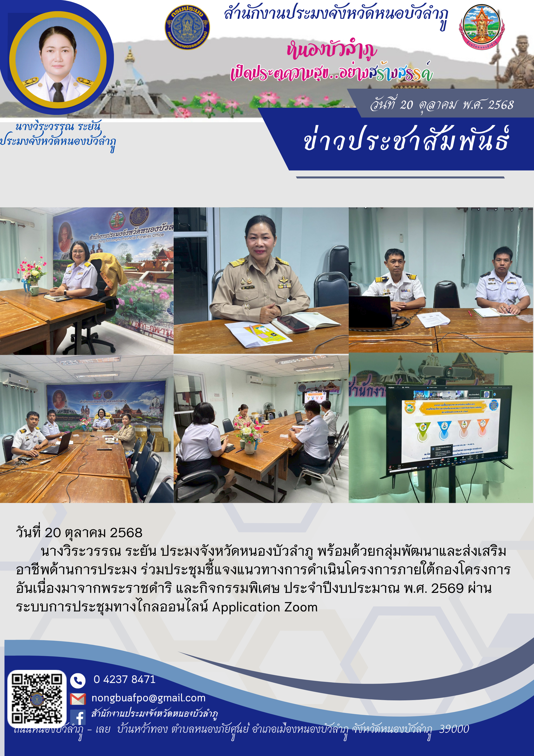 นางวิระวรรณ ระยัน ประมงจังหวัดหนองบัวลำภู พร้อมด้วยกลุ่มพัฒนาและส่งเสริมอาชีพด้านการประมง ร่วมประชุมชี้แจงแนวทางการดำเนินโครงการภายใต้กองโครงการอันเนื่องมาจากพระราชดำริ และกิจกรรมพิเศษ ประจำปีงบประมาณ พ.ศ. 2569 ผ่านระบบการประชุมทางไกลออนไลน์ Application Zoom